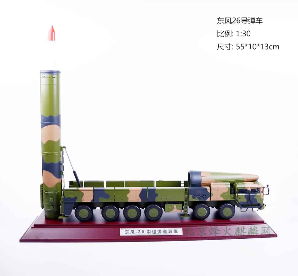 东风-26弹道导弹是中国一代液体弹道导弹更新换代的产物,是新一代中远程固体燃料弹道导弹 ,为核常兼备导弹,且具备打击大型水面舰艇的能力,射程可达3000至4000千米,覆盖关岛甚至迭戈加西亚群岛,使中国拥有了可靠的打击第二岛链固定目标和大型舰艇等目标能力,是衔接东风-21弹道导弹与东风-31弹道导弹的主力中远程弹道导弹。