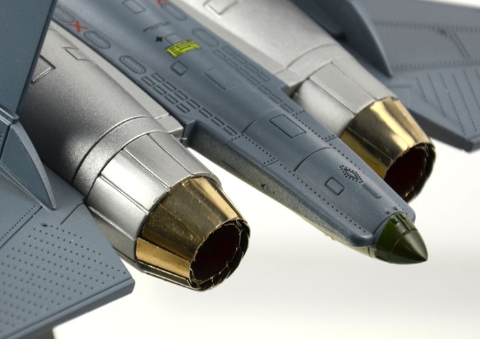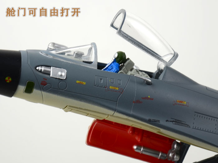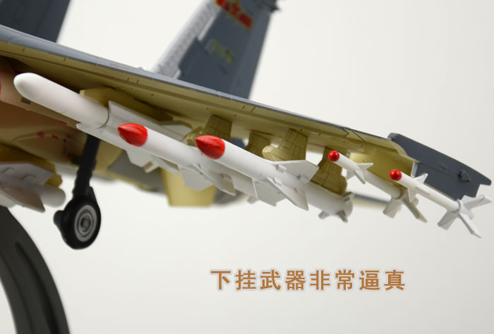 做工精细 驾驶舱 减速板可以打开,矢量喷口做成金属材质并可收缩,飞机的主翼、尾翼的前后边条翼均可活动,机轮可转动,机身喷涂均匀,各类标识元素均一一标出,飞机可在不锈钢支架是做出各种飞行姿势。