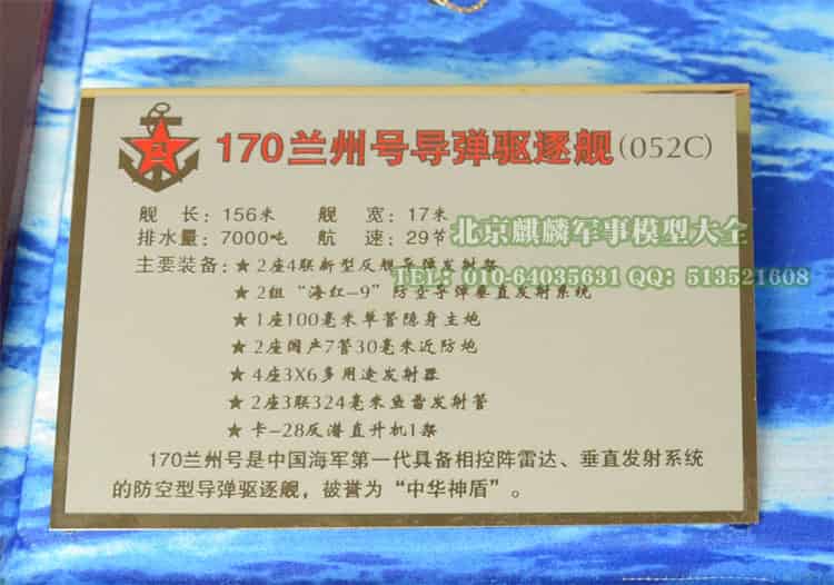 中国军舰 之 导弹驱逐舰模型有多个型号,比例有:1:200(大)和1:350(小)两种规格,模型材质采用金属和树脂的合成,做工相当细致,模仿的惟妙惟肖,普遍适用于:观赏、装饰、送礼、教学等。