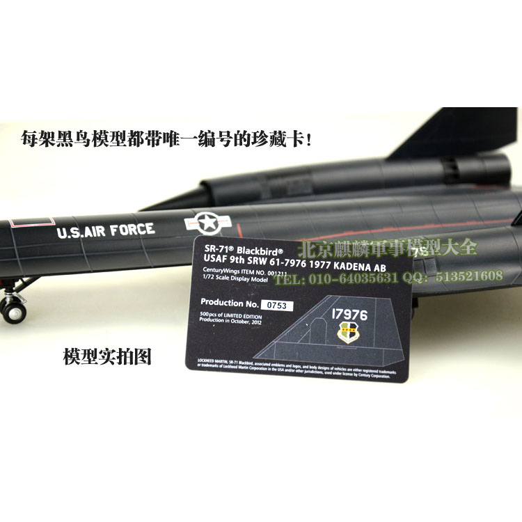 模型采用全金属机身,非常有质感,舱门可以打开,底部机轮也可以安装拆卸。每一架SR-71黑鸟高空侦察机模型都有唯一的珍藏编号,非常珍贵。