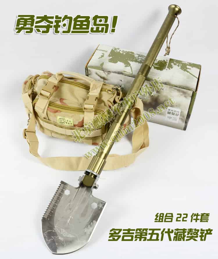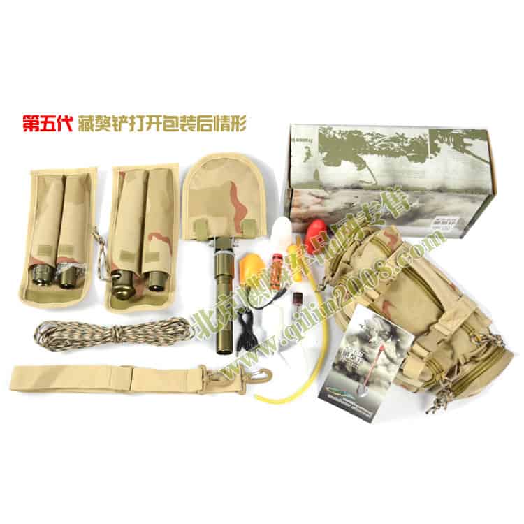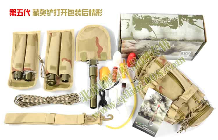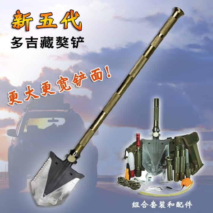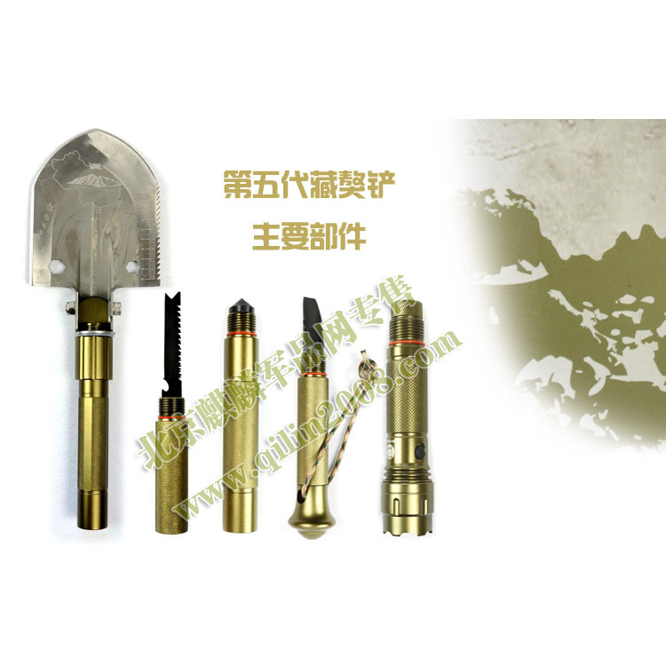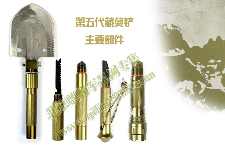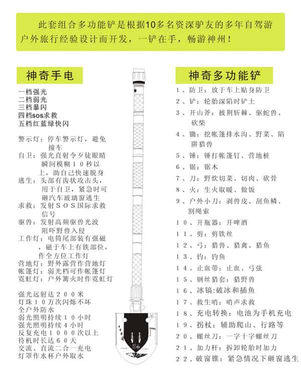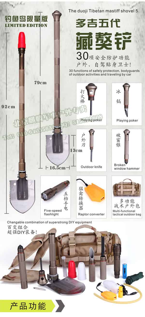 多吉藏獒铲的把手采用可拆卸式多节组合,每节都有一个自身功能,有:强光手电、户外生存刀、冰镐、破窗器、生火镁棒。
