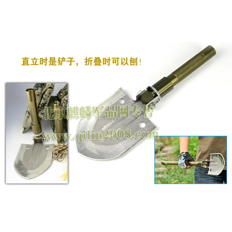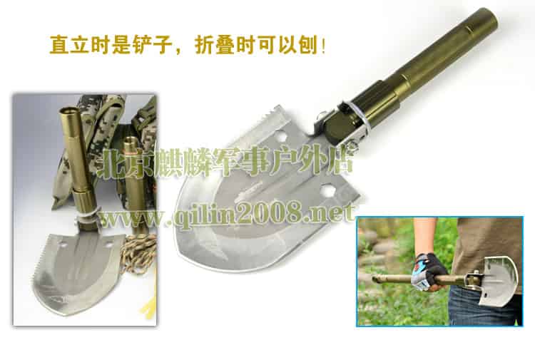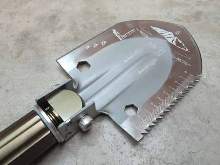 铲子上有米尺测量工具,锯齿砍伐工具,螺丝扳手工具。