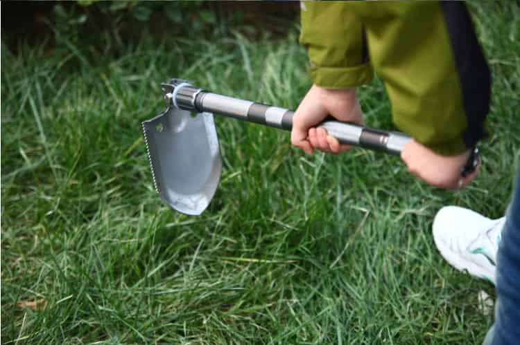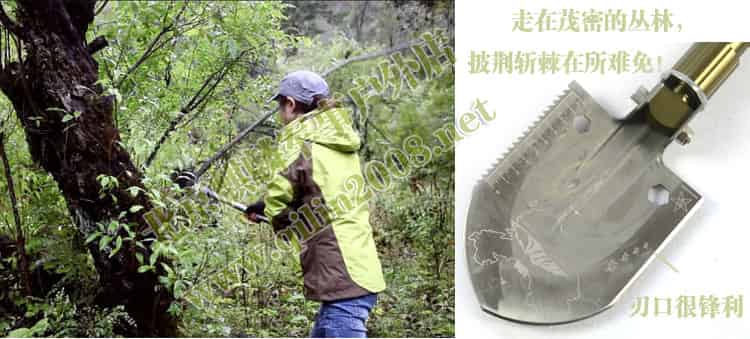 铲头的左侧设计为刃口,右侧是锯齿状,因此,除了铲土和刨土外,还可以对树木、荆棘进行:锯、砍、削等用途,这对于野外生存赶路的朋友来说,是个非常实用的功能。