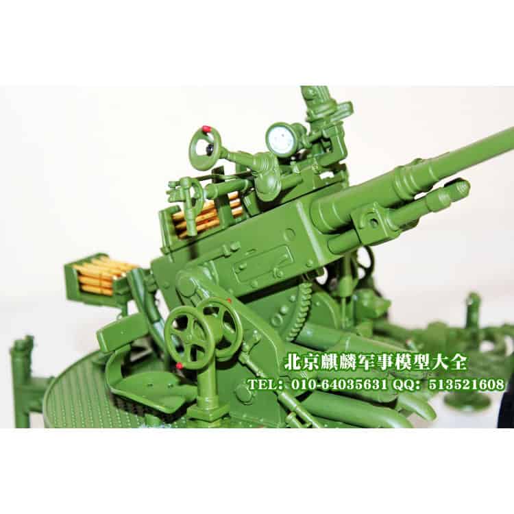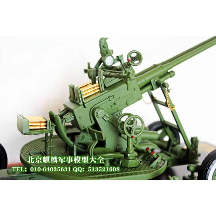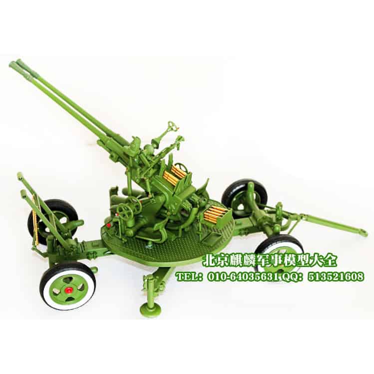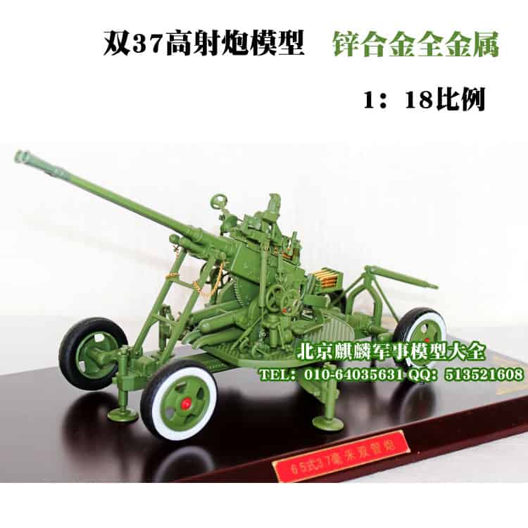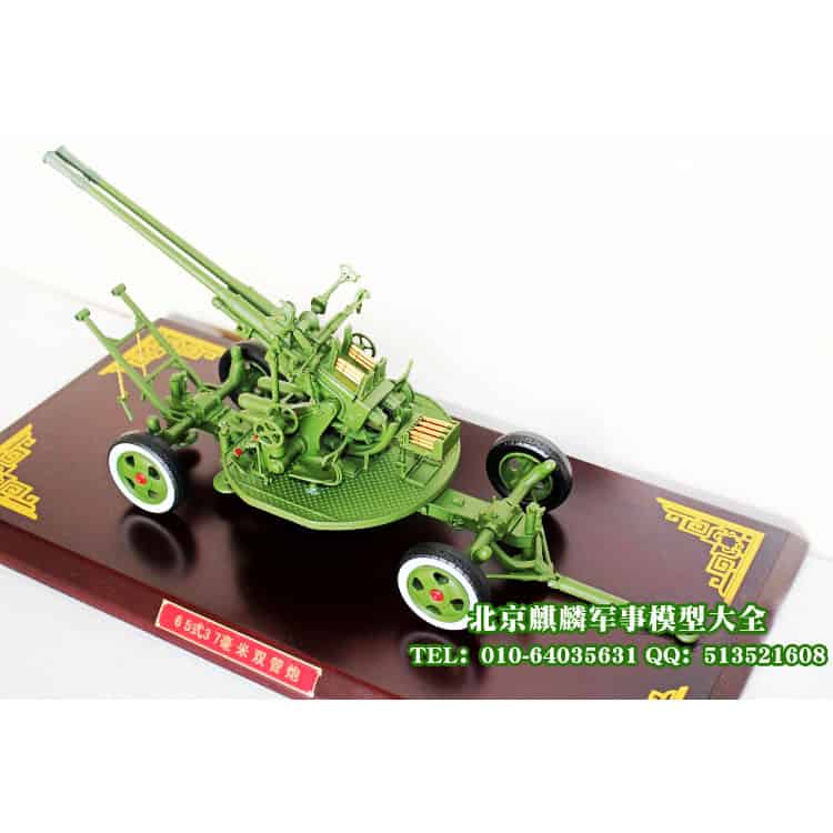 65式双管炮模型是以实物为基准制造的高精度高档仿真模型,该模型创意独具、造型威武雄壮,材料珍贵,工艺复杂精湛,是军政馈赠和个人收藏的理想佳品,极具珍藏价值,也是军队教学的模型精品。全炮模型共139个零部件,高炮的车轮、液泵摇把、牵引杆、方向机、高低机等多处部位可仿真转动。炮体能够360度转动,炮管能够在2-87度范围上下摆动;左右炮脚可做前90度移动,炮床和炮脚上用来支撑火炮的螺杆可上下旋转升降;指示器刻度清晰可见。