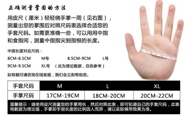 【尺寸说明】:手宽:掌中线不加拇指宽度为准,8.5厘米-9厘米(9号M)。9.5厘米(10号L)。10厘米以上(11号XL)