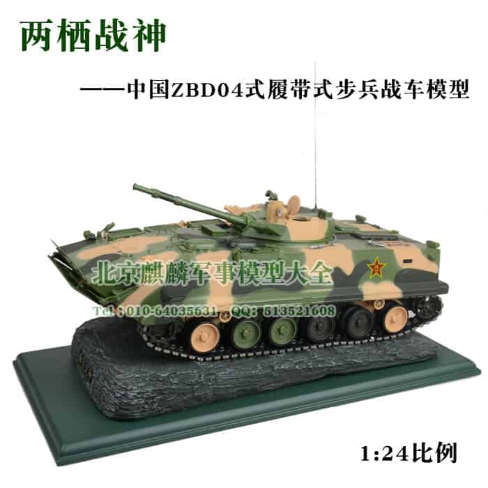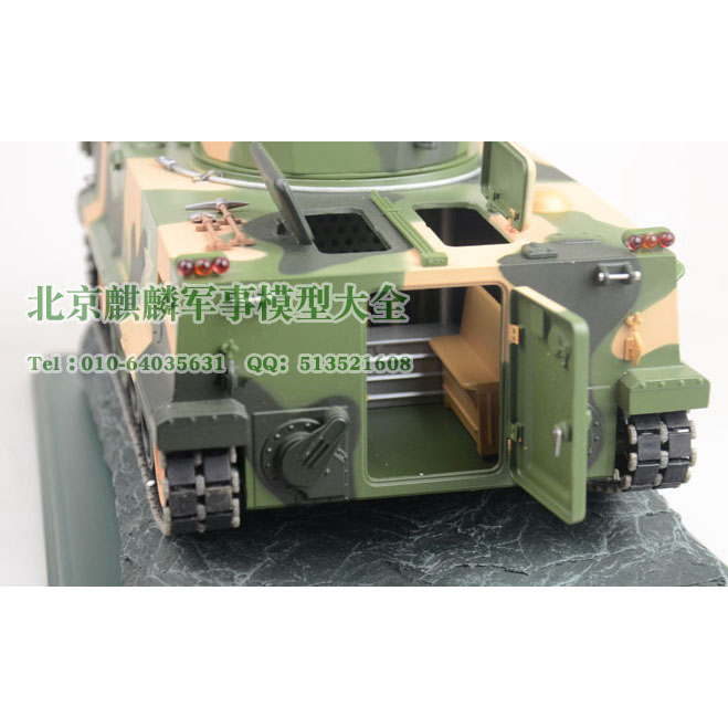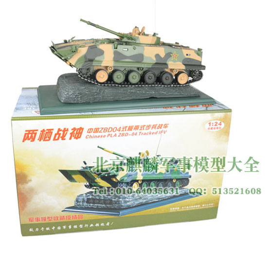 “04式履带步战车”是以我国最先进的04式履带步兵战车为原型,严格按照1:24的比例,采用多种材质,运用多种加工工艺,结合最先进的数字化加工设备精工制作而成。共动用了34套模具投入制作,零件数高达1470件。车身整体采用合金压铸,炮塔可360度自由转动,炮管可在上下射界内摆动;驾驶仓和作战仓盖均可打开,仓内座椅、操控台均详细做出,作战仓内部旋转炮弹装填机构及炮弹均详细做出;步兵仓顶盖和车后门均可打开,仓内空间、坐椅均详细做出,车后门有打开和关闭锁扣,车门把手垂直向下为车门关闭状态,将把手顺时针转动90度车门则可以打开,反之则关闭车门;履带高仿真结构,能带动主动轮、从动轮及负重轮平稳转动,每个负重轮均有单独减震功能;车后左右排水闸口盖板均能旋转打开;左右倒后镜可以任意调节方向;挡浪板高仿真结构,开启和闭合状态均有自锁功能;烟幕弹发射器、散热器、观察窗、潜望观察镜、拖曳钩、铁锹工具,尾灯等均详细做出。该模型仿真度极高,属收藏级军事模型的经典之作,是馈赠与收藏的上佳。