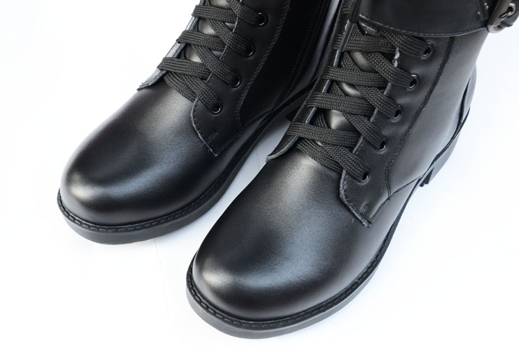 这款女士靴不仅在前侧可以系带,在靴腰的内侧带有侧拉链,穿脱工方便!