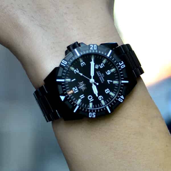 “指挥官”表的夜光,它采用的不是常规的那种夜光手表通过吸收外界光能,如阳光、灯光后发光的方法,而是采用“自发光”