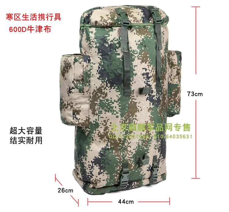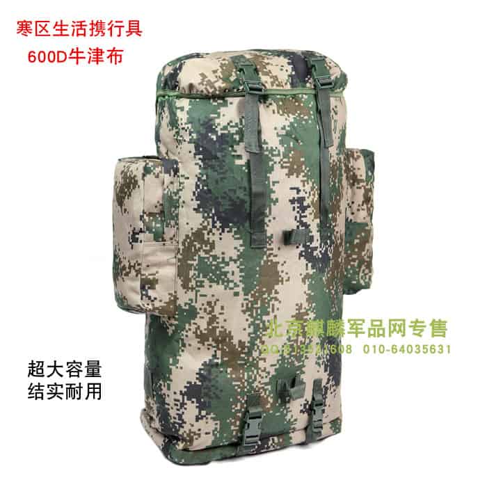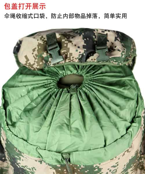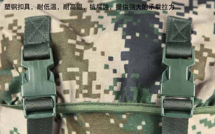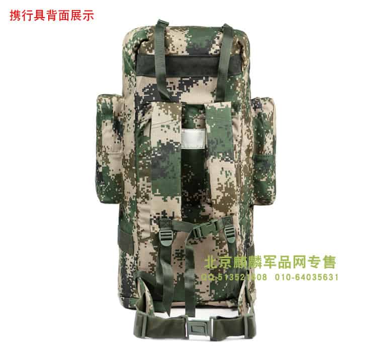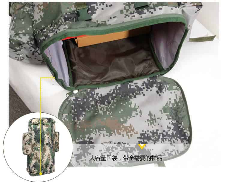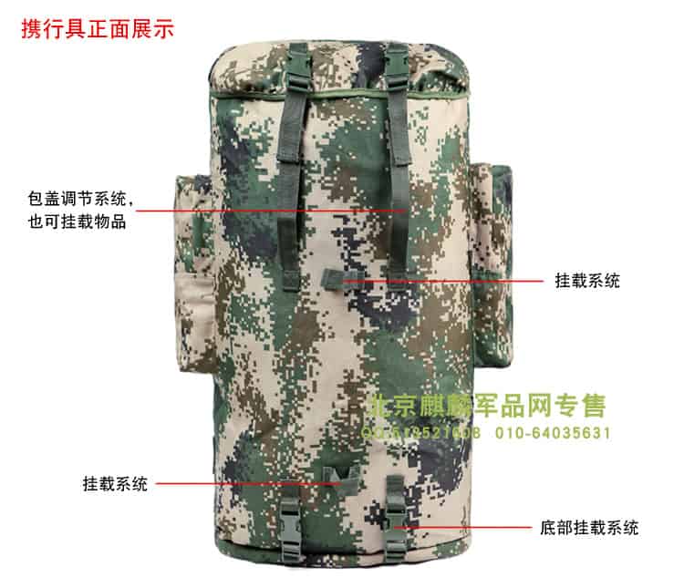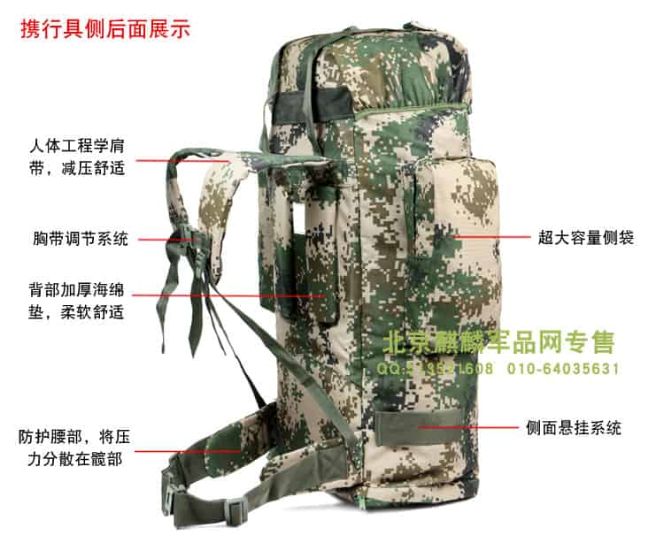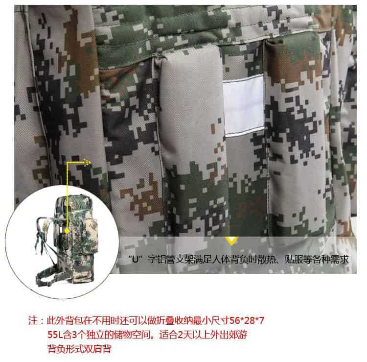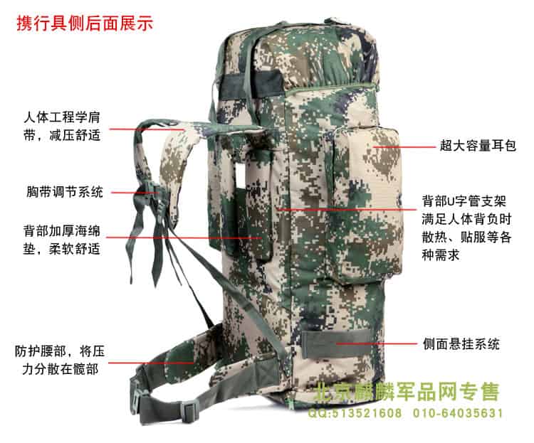 结构:防红外防水外料,背部有两个海绵垫,包内有金属支架,确保腰部不易劳损。左右两个耳包。尼龙加长袋,量度极大。底部设有拉链,使用者可以很方便地从背包的底部抽取比如睡袋等物品。