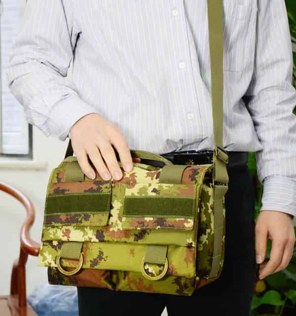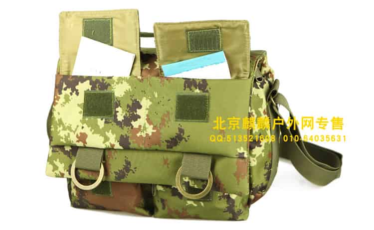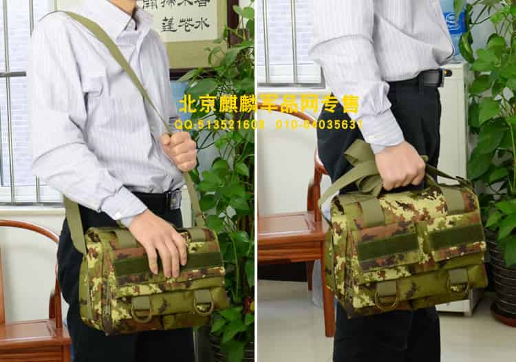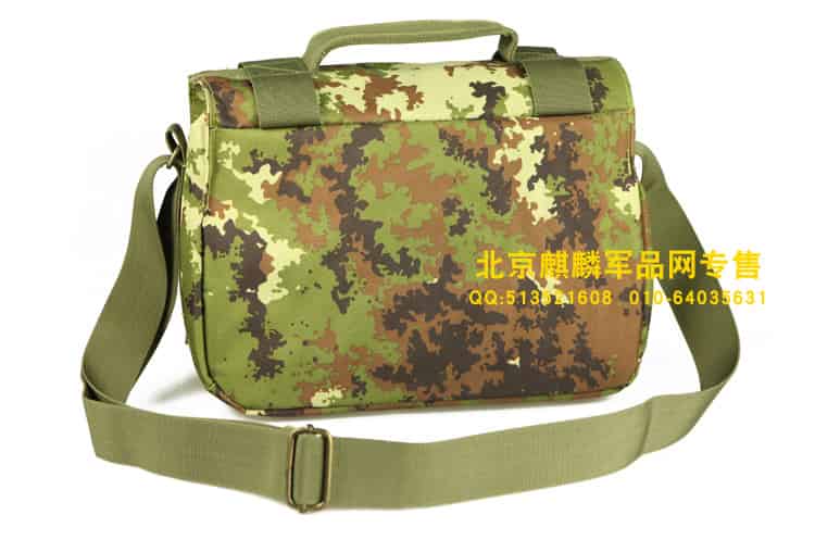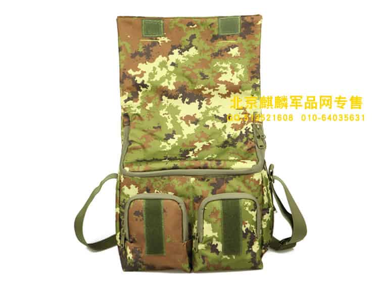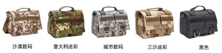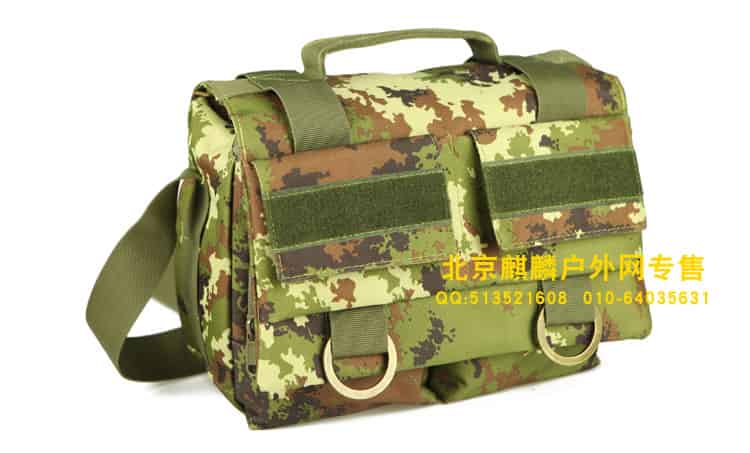 这是一个背着感觉不大不小的便携挎包,如果作为摄影包使用,它的容量足可以让你除了装下一部专业单反相机、两个镜头,再装一些辅助配件,一个包就解决问题了。如果不做摄影包使用,它完全能满足你日常短途旅游需要携带的物品。本包颜色名称为:意大利丛林数码迷彩,也是最赶潮流的军旅颜色。请欣赏图片: