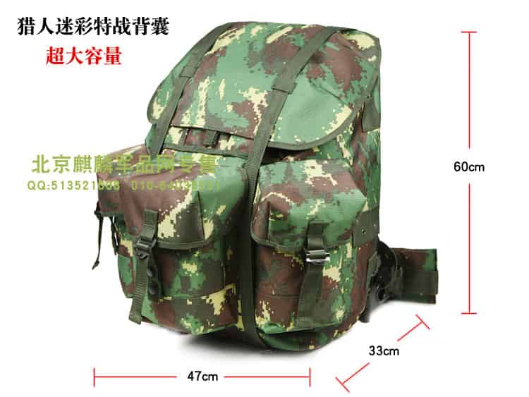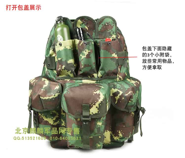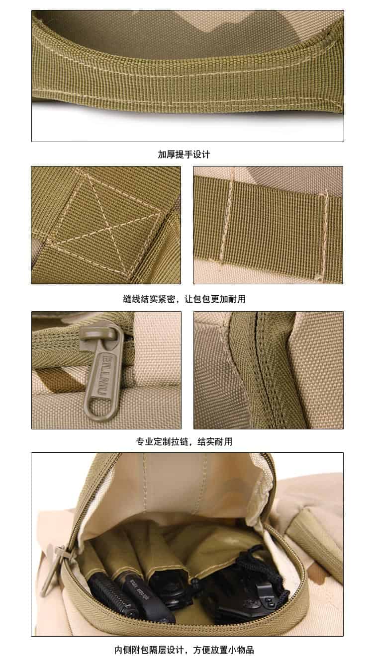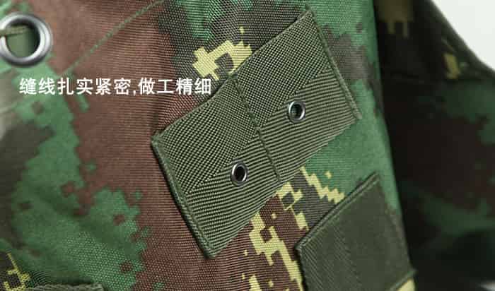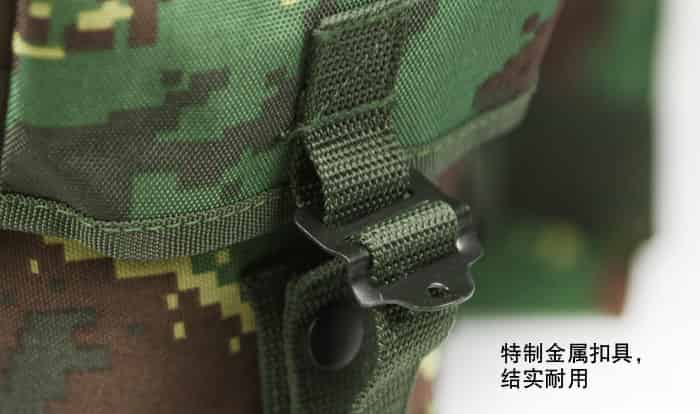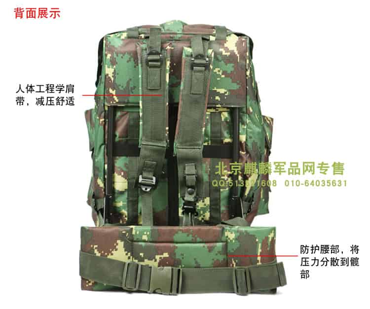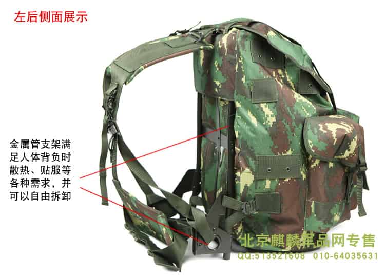 细节:PU防水涂层,面料具有防水拒水功能,加厚背板,所有扣件全为定制扣具,使用高档金属材料,高强度,高韧性,辅料中的织带以及所有的缝合线,采用了军规尼龙材料,强度高,同时保证湿水以后不会腐烂,包体正面、侧面配置MOLLE系统,方便对背包进行扩展,背部支架为铁支架,舒适耐用。
