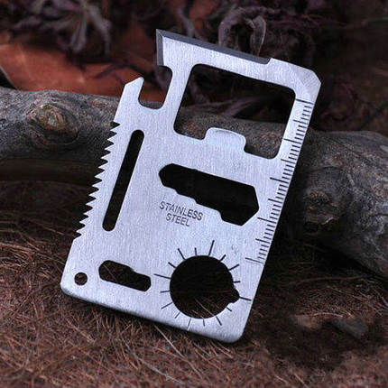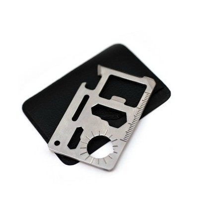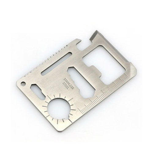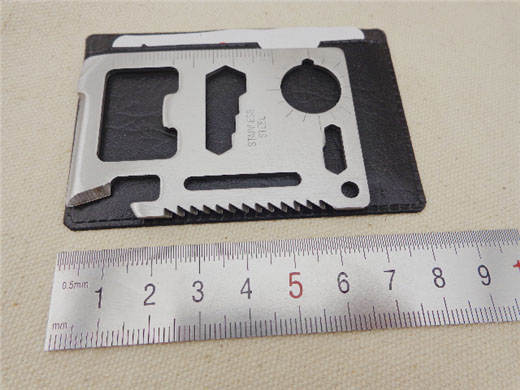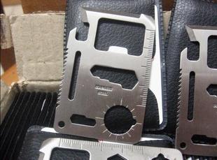 420优质不锈钢整体,做工精致,正反面均光亮平整,决无毛边,外贸出口产品,配图纸说明,刀刃锋利,钢体坚固,锯齿更是在薄薄的卡片上采用双排交错齿。整块高硬度不锈钢一次成型,强度高,刃口锋利。规格同信用卡大小相仿,外带黑色皮革保护套,能够避免刃口伤及自身,并可放入钱夹随身携带。