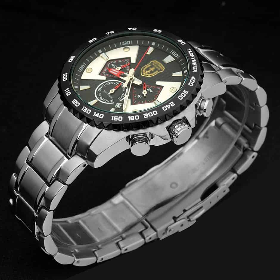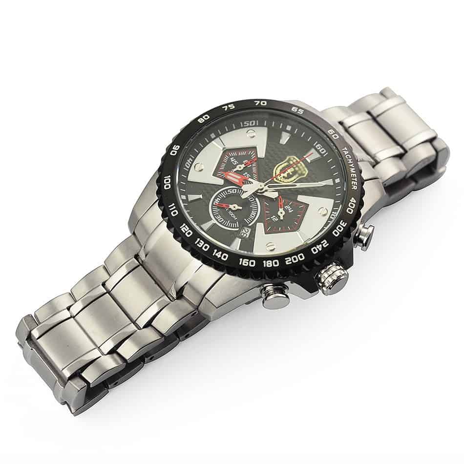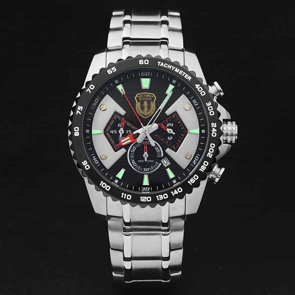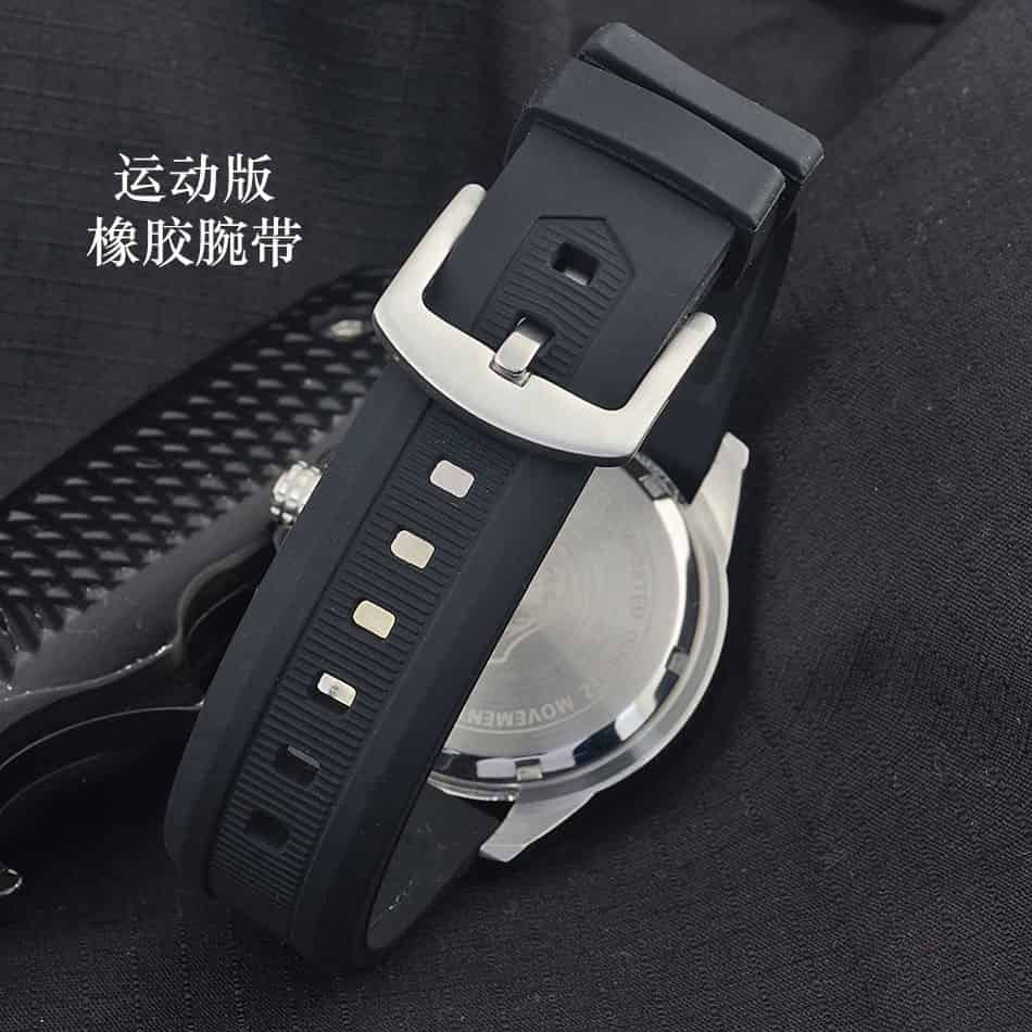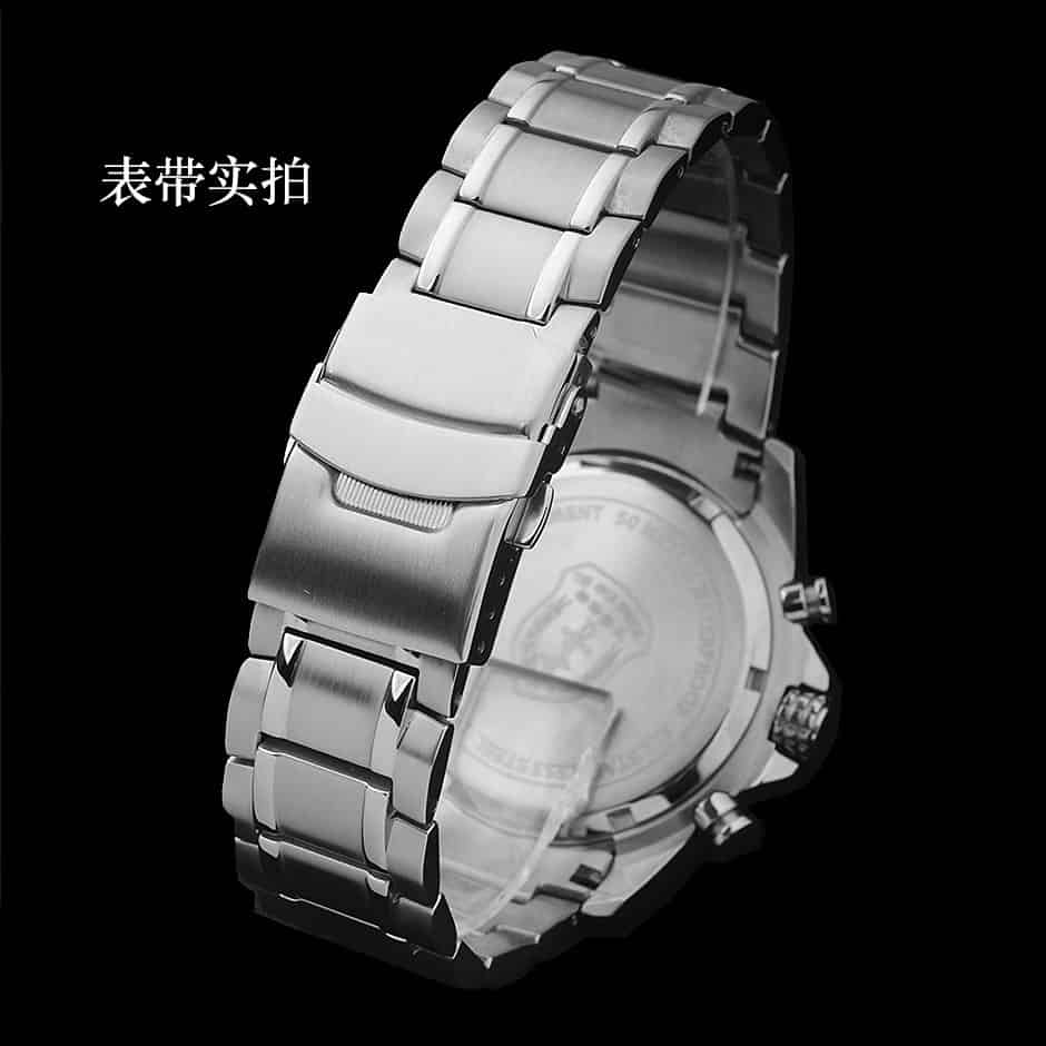 战神G-817型款腕表表盘大,尺寸大,功能多。原厂表带很长,适合喜欢大表盘的手表买家,不用担心链子不够长了。采用原装进口多功能机芯,除正常显示时间、日期外,还具有24小时时历显示和运动计时功能等。表盘设计理念来自某名牌跑车的驾驶仪表台。表盘三点和9点钟方向两侧镶嵌的C型银色金属片,使用航空材料钛合金,和火箭飞机使用的材质相同。很有个性。表壳和表带均采用316号不锈钢制造,结实耐用,长久如新。表带采用双保险式折叠表带,很坚固。