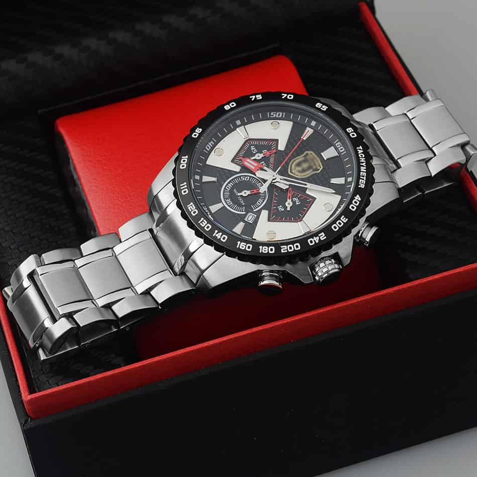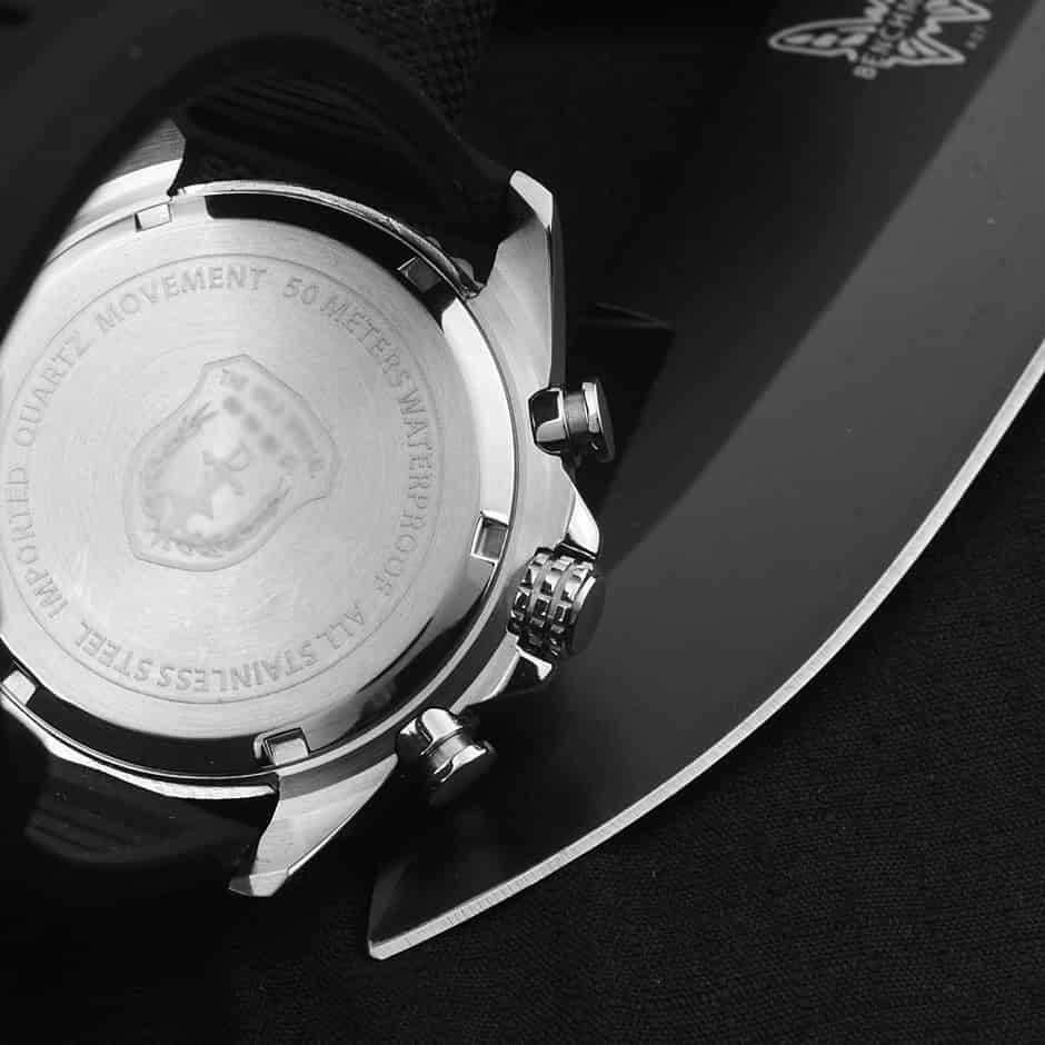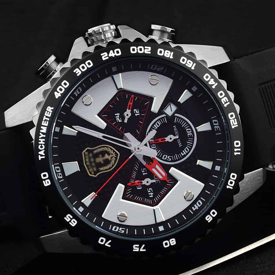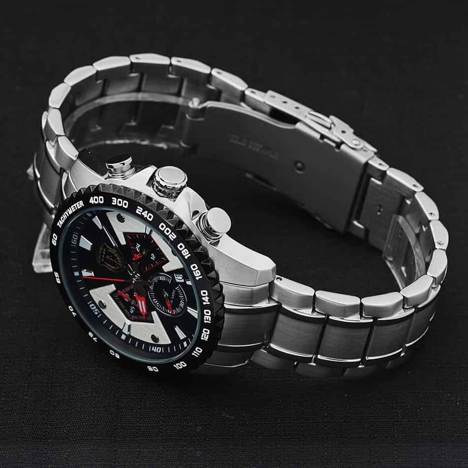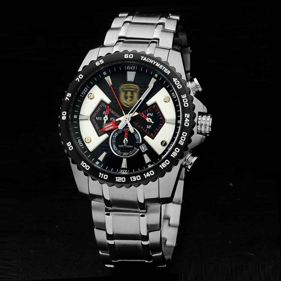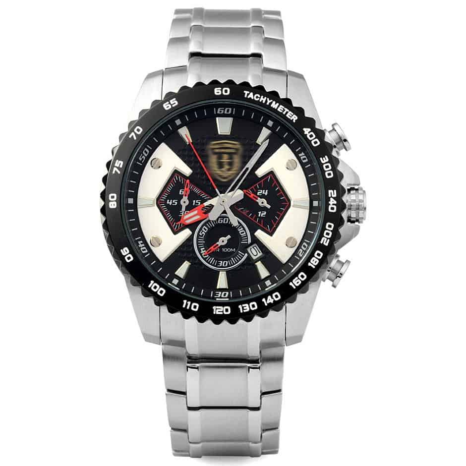 战神G-817型款腕表表盘大,尺寸大,功能多。原厂表带很长,适合喜欢大表盘的手表买家,不用担心链子不够长了。采用原装进口多功能机芯,除正常显示时间、日期外,还具有24小时时历显示和运动计时功能等。表盘设计理念来自某名牌跑车的驾驶仪表台。表盘三点和9点钟方向两侧镶嵌的C型银色金属片,使用航空材料钛合金,和火箭飞机使用的材质相同。很有个性。表壳和表带均采用316号不锈钢制造,结实耐用,长久如新。表带采用双保险式折叠表带,很坚固。