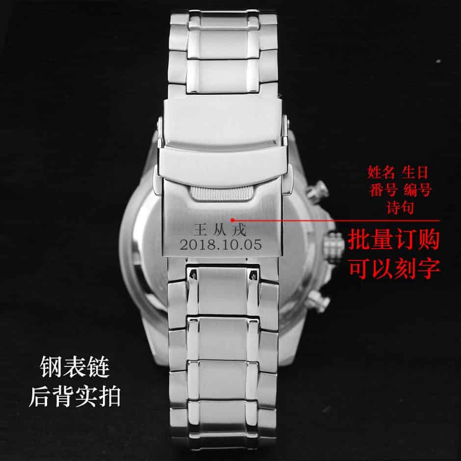 1、可以在表带按扣、后背等处用激光刻文字、英文、数字、LOGO图案,比如诗句,姓名,生日,番号等内容,字数1~20个字之内。单次购买手表在1000元以上或单次5只以上可以免费刻字。单次买表在1000元以下的,刻字每只表收费30元。