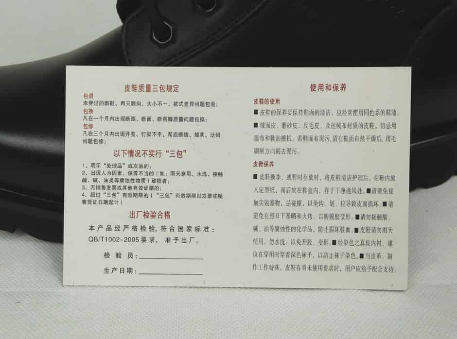【技术支持】 本产品按照ISO9001质量控制体系制作,经严格检验,符合国家标准:皮鞋QB/T1002-2005要求