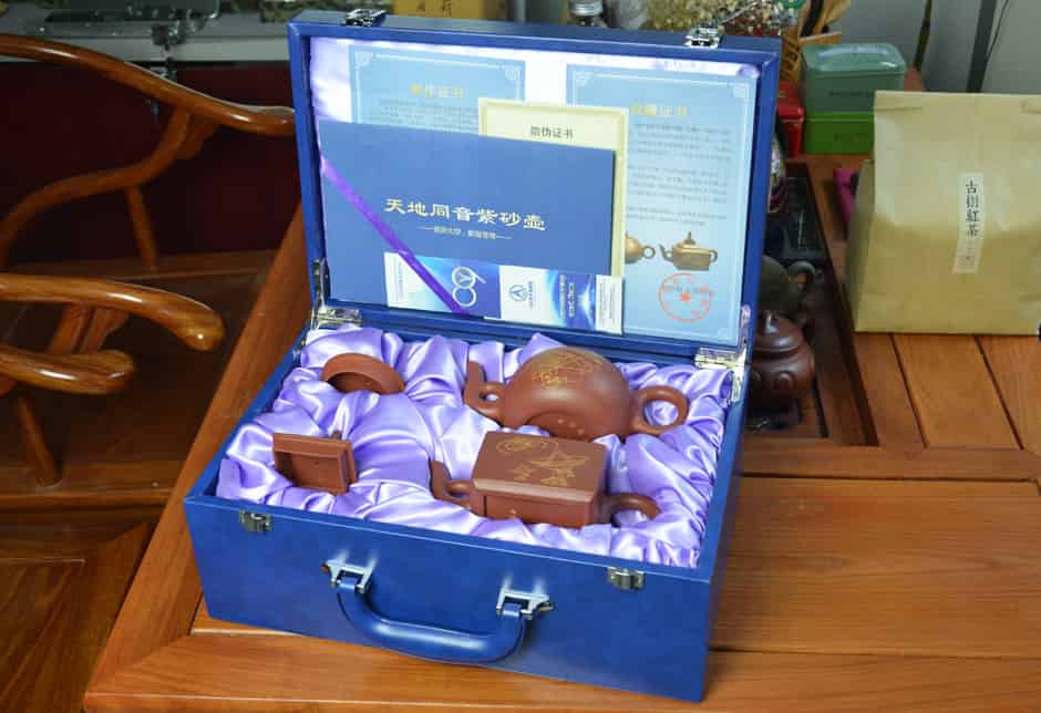 本套天地同音紫砂壶包含物品有:天圆地方紫砂壶2把、制作证书1本、收藏证书1本、防伪证书1本、高档皮质礼盒手提箱1个。