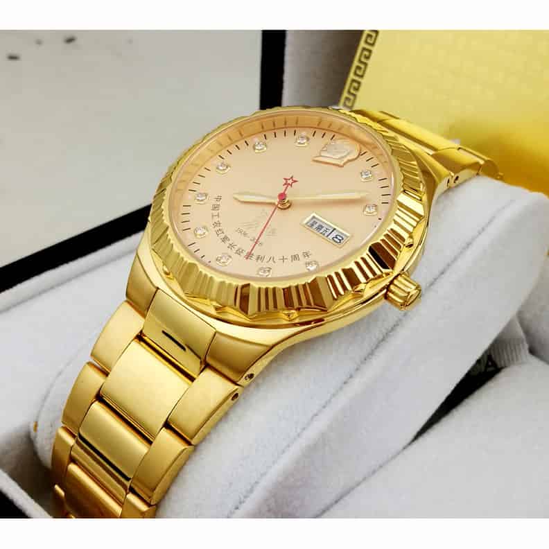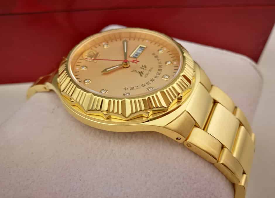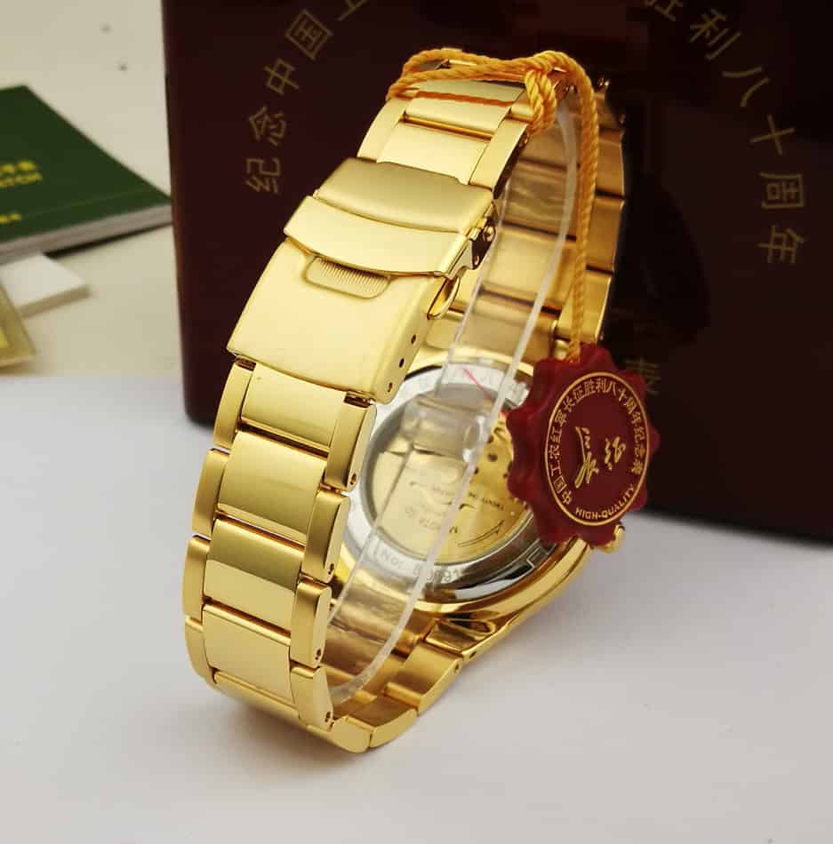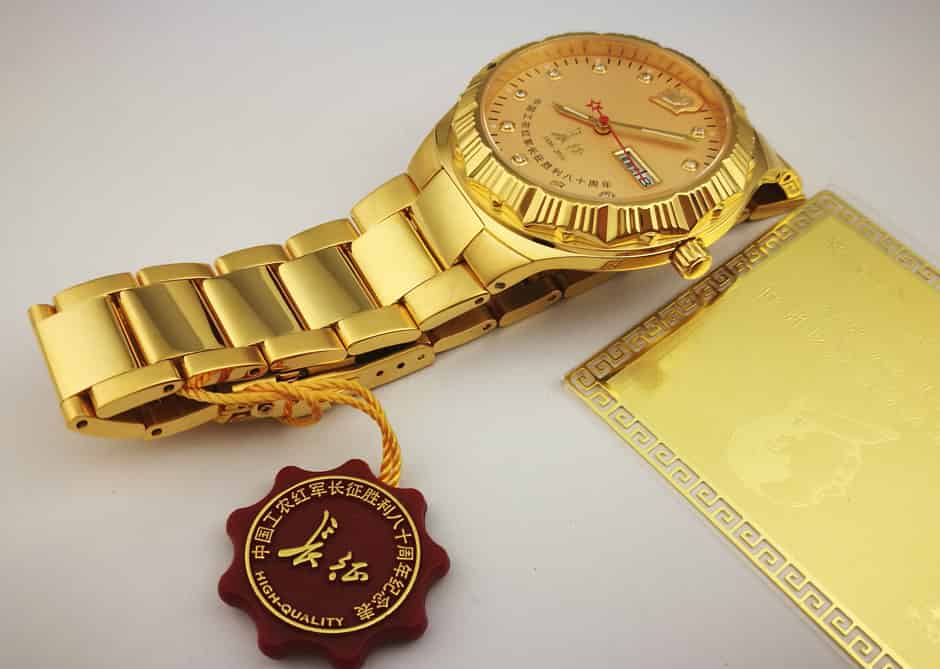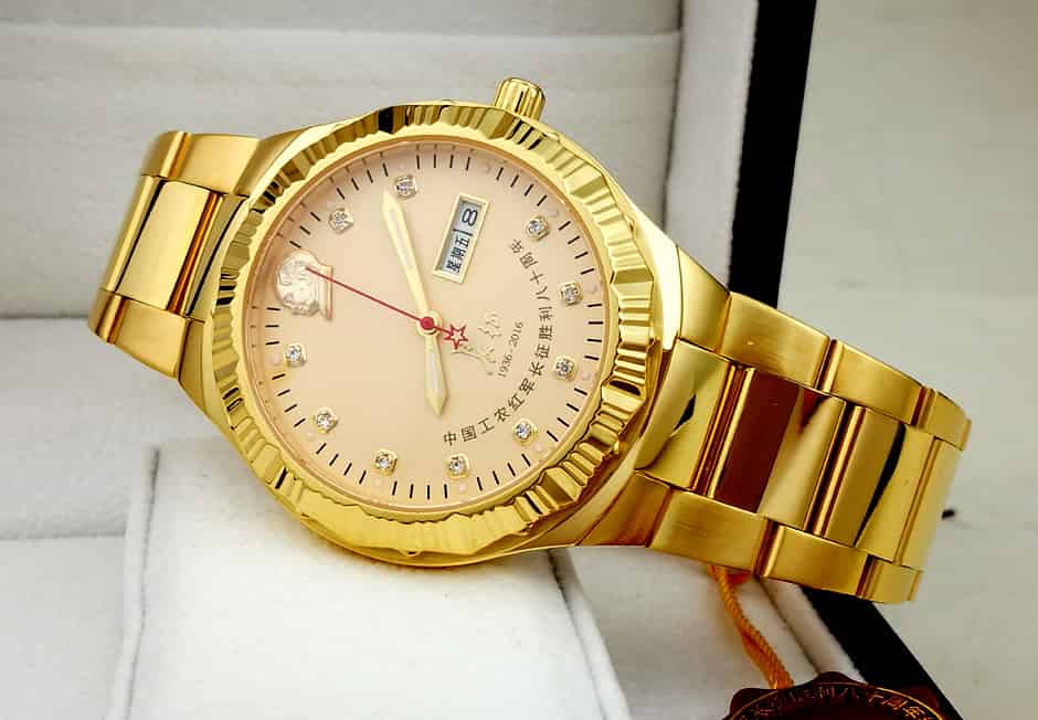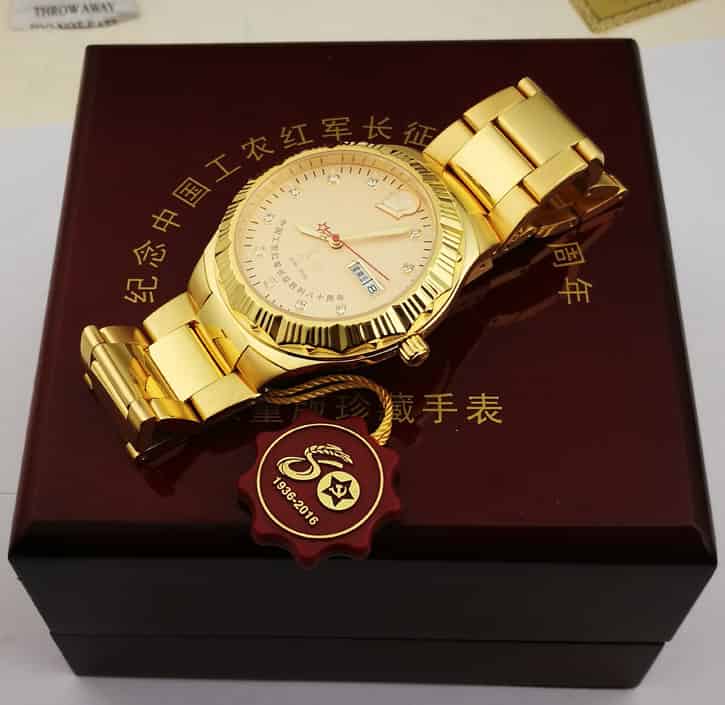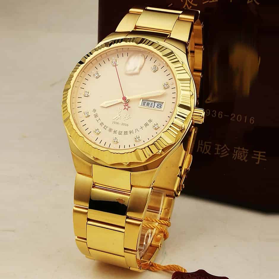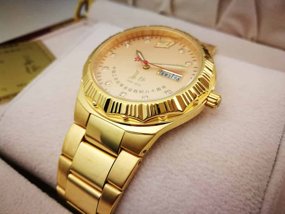 长征胜利80周年表很有特色,它的外形设计灵感来自于勋章。配件和用料实在,手表机芯采用原装进口21钻机械全自动机芯,走时准确。表镜面采用蓝宝石表镜,硬度非常高,可确保它崭新没有划痕。表壳和表链采用优质精钢外镀24K金,不会脱色,可以放心佩戴。手表具备50米防水,带夜光,双日历等功能。 每一个组成部分都使用较好的配置,加上实惠的价格,因此它将成为大家买表的备选。