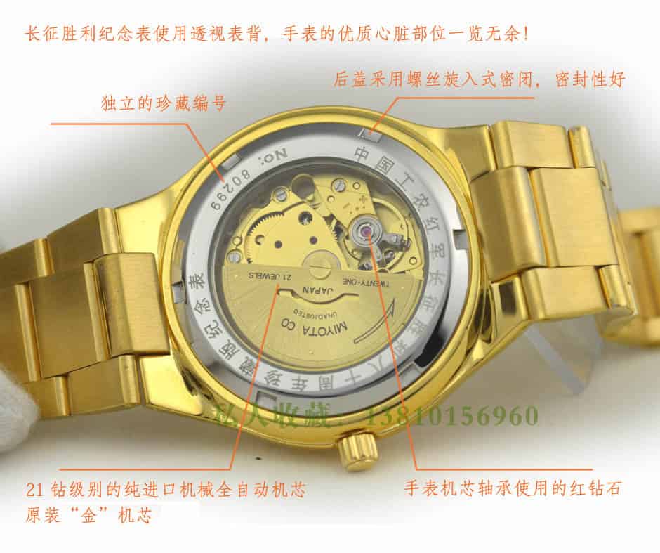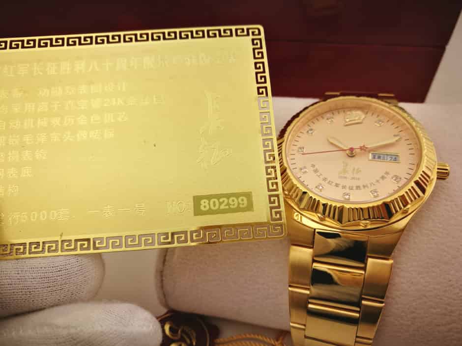长征80周年纪念表每只表都有独立的数字珍藏编号,编号就是它们的身份证,每只表都配有相同编号的珍藏金卡(金卡为纯钢镀金),统一一致,收藏价值更好。