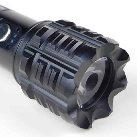 神獒战术手电整体构造很实用,头部采用一体化攻击头,外出使用可以用于防身。中部带有电量显示,手电开关按键。尾部有手绳孔。手握处带有三大处防滑设计,看起来利落大方。