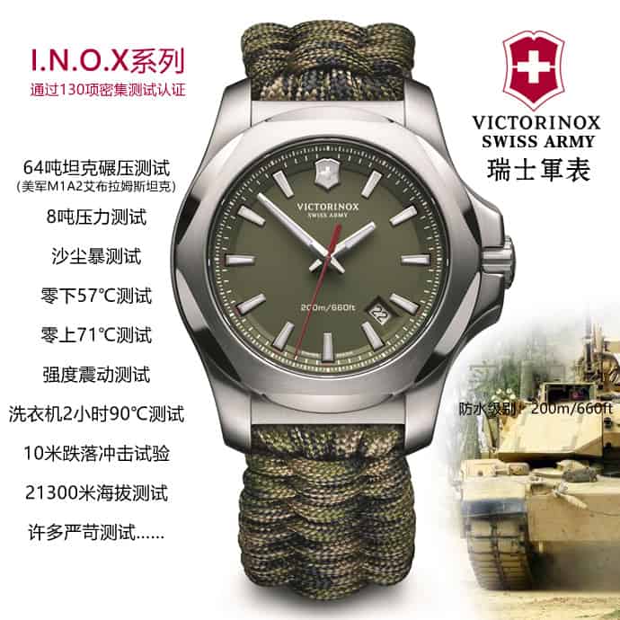 INOX系列瑞士军表能够应对生活中的各种冒险,INOX腕表能应付各种各样的极端条件,例如中10米高处坠落而完好无损,承受住64吨重量的坦克碾压而过,潜入深达200米以下的水底。它们的设计美观,无论是在办公室还是在山野间、大海里,不分昼夜,I.N.O.X经久耐用的性能无出其右,完美沿袭了瑞士军刀的精神。