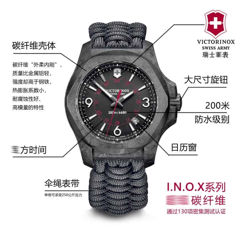 Victorinox(瑞士维氏)的历史,与品牌的经典瑞士君刀互相呼应。 I.N.O.X. 腕表系列谱写全新腕表传奇,斜面切割表圈、三针设计及日期显示,保留简约设计但不失复杂技术。 I.N.O.X. 腕表成功演绎 Victorinox Swiss Army 的骄人特色,经历特设的 130 道难关而诞生,每枚腕表均以好成绩通过 130 个严苛测试,各项细节均为匠心之作。 I.N.O.X. 突破制表界的许多制造技术,树立全新的钟表耐用规则,带来功能与质量并重、造型鲜明的腕表系列。