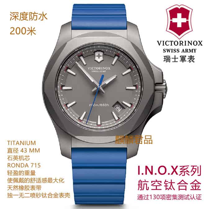 Victorinox(瑞士维氏)的历史,与品牌的经典瑞士军刀互相呼应。 I.N.O.X. 腕表系列谱写全新腕表传奇,以完美比例、斜面切割表圈、三针设计及日期显示,保留简约设计但不失复杂技术。 I.N.O.X. 腕表完美演绎 Victorinox Swiss Army 的骄人特色,经历品牌特设的 130 道难关而诞生,每枚腕表均以卓越成绩通过 130 个严苛测试,各项细节均为匠心独运之作,精准至微米程度。 I.N.O.X. 突破制表界的极限,树立全新的钟表耐用规则,带来功能与质量并重、造型鲜明的腕表系列。