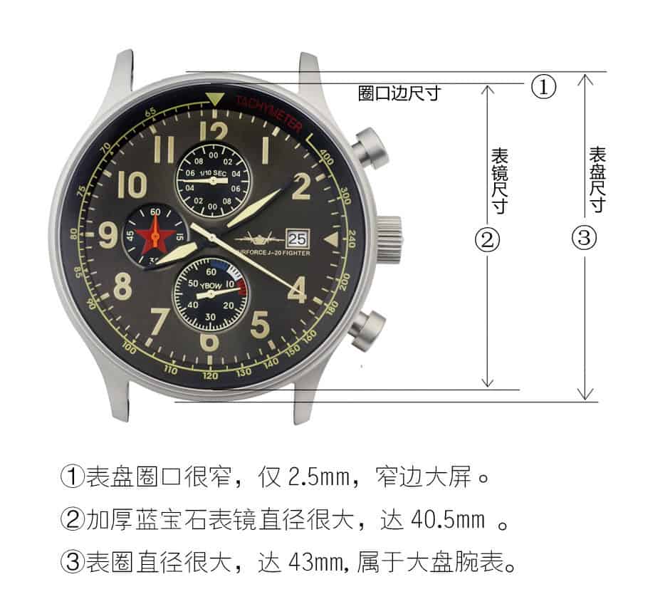 本款歼20腕表尺寸稍大,比国内常规手表的直径大很多,仅表镜直径就达到40.5毫米,表圈口边很窄。它的尺寸,在战神手表和近些年出产的表中属于偏大尺寸的。再加上蓝宝石镜面的硬度很高,透光性很好,戴起来真感觉很大气。