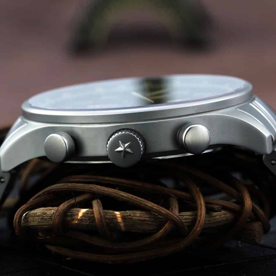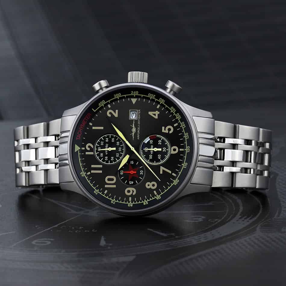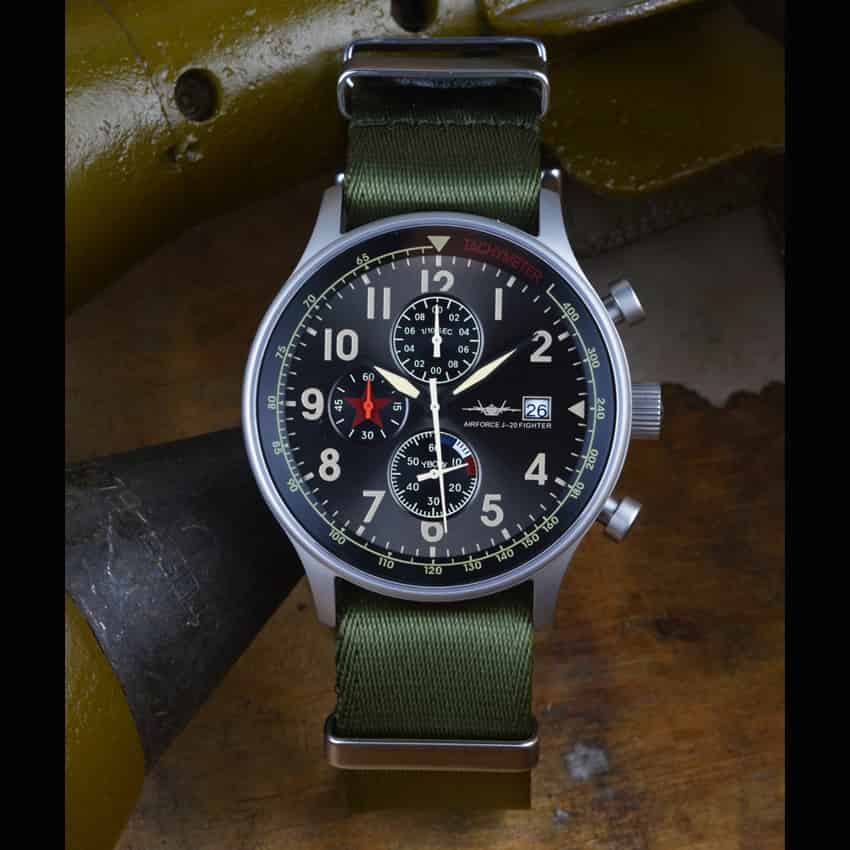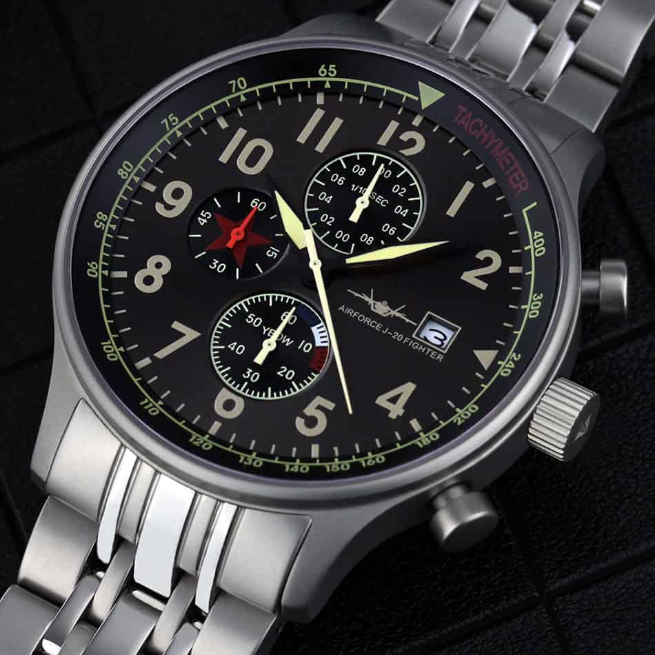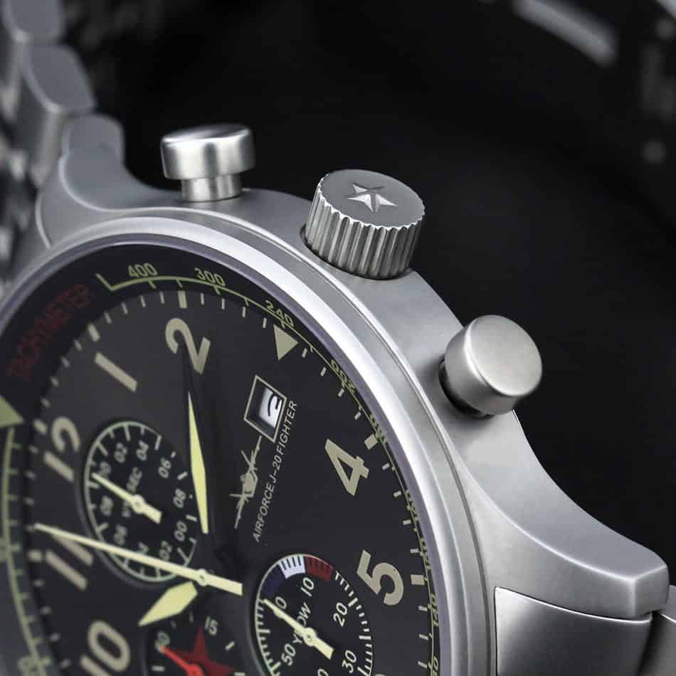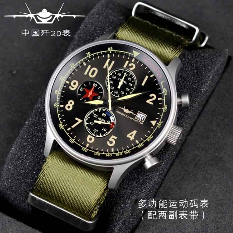 歼20腕表秉承高质量理念,手表几大构件采用好的配置,比如:表镜采用比常规1.1毫米加厚至1.5毫米的蓝宝石镜面,机芯使用进口原装多功能机芯,表壳采用316号精钢材料,外表钛砂哑光处理。为您配置两条表带,分别是一条金属表带,另一条绿色帆布腕带,也使用进口尼龙带,表带卡扣头使用实心加厚不锈钢,结实耐用。