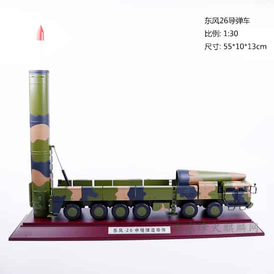 东风-26弹道导弹是中国一代液体弹道导弹更新换代的产物,是新一代中远程固体燃料弹道导弹 ,为核常兼备导弹,且具备打击大型水面舰艇的能力,射程可达3000至4000千米,覆盖关岛甚至迭戈加西亚群岛,使中国拥有了可靠的打击第二岛链固定目标和大型舰艇等目标能力,是衔接东风-21弹道导弹与东风-31弹道导弹的主力中远程弹道导弹。