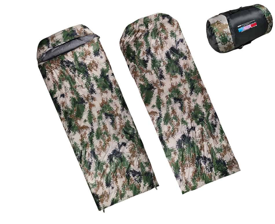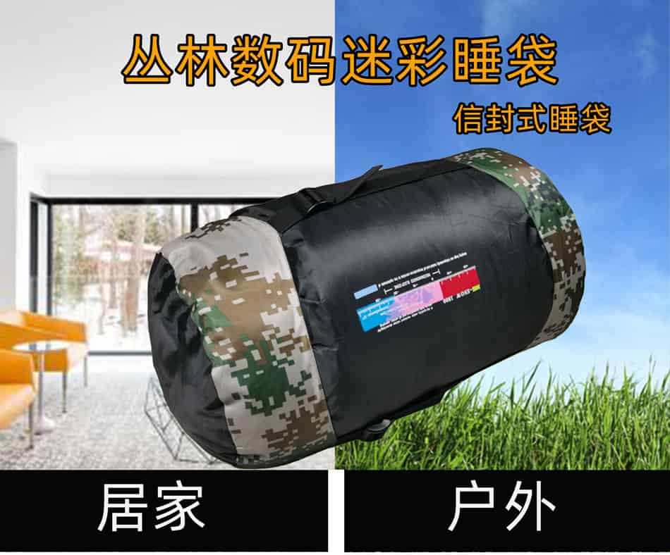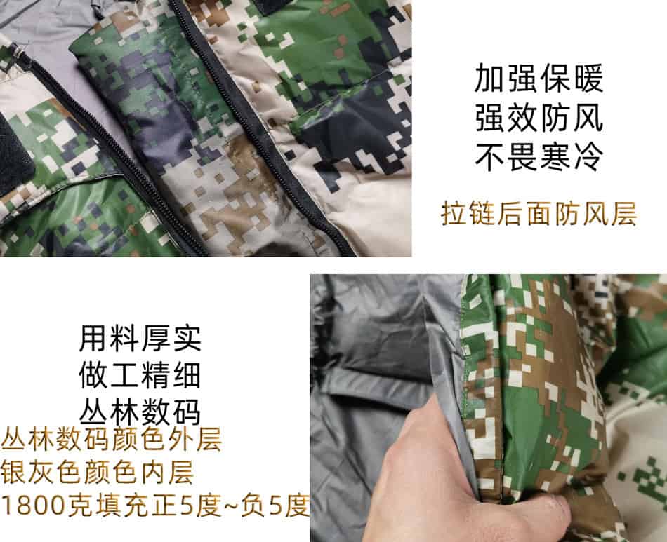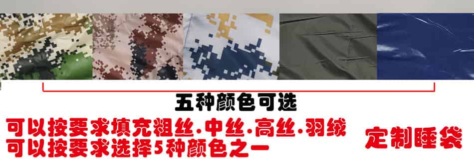 本款是当时专为特殊单位定制的一批户外迷彩睡袋,睡袋分粗丝.中丝.高丝.羽绒,四种填充材质,其中粗丝.中丝.高丝都是羽丝,高丝是羽丝里较好的一款,中丝中等,粗丝一般。羽绒款为填充90%羽绒含量,保暖效果特别好,适合在寒冷地区使用。羽丝3款填充材料设计款式是信封式,羽绒填充材料设计款式是妈咪式,下面图片有写明适合使用温度,请细看。拥有5种颜色可选,可以选择内部填充材料,喜欢哪个拍哪个!