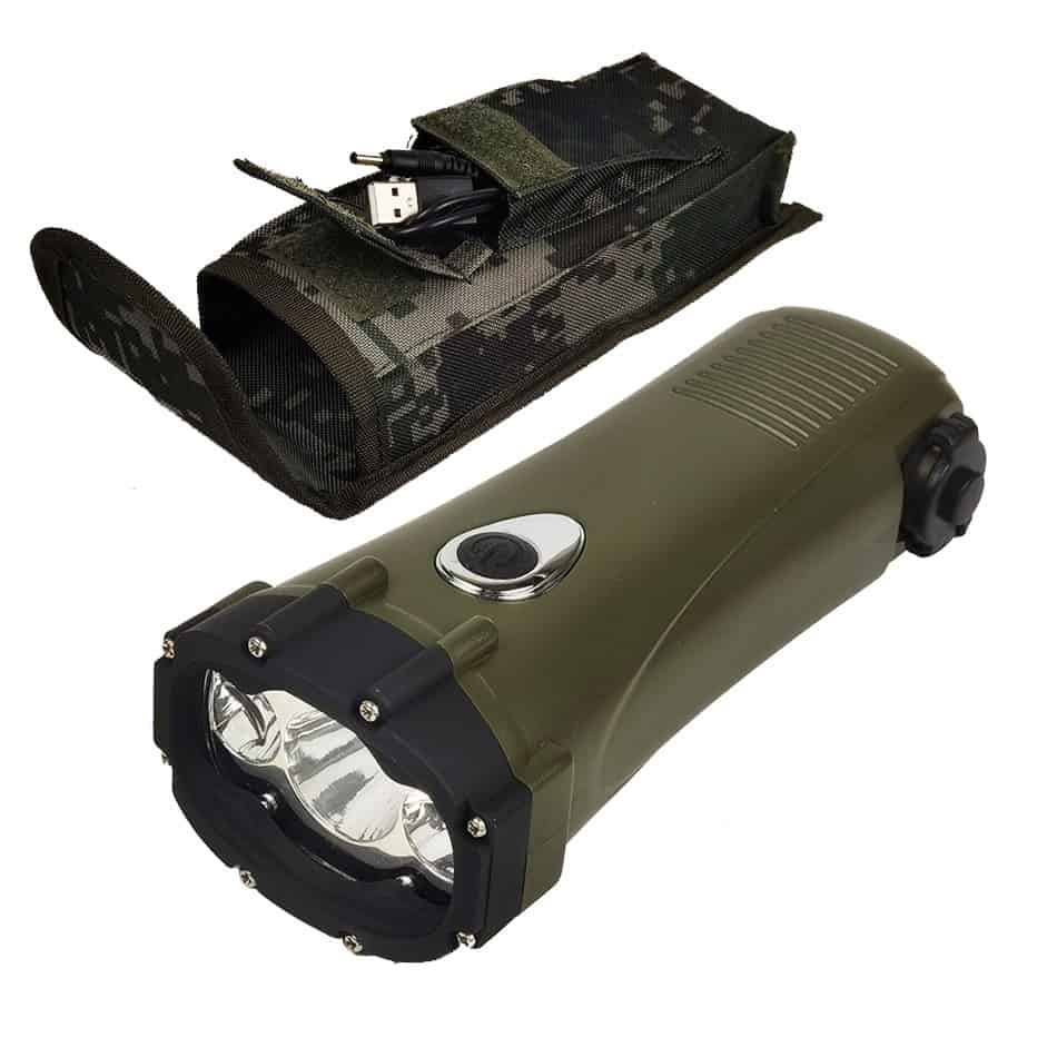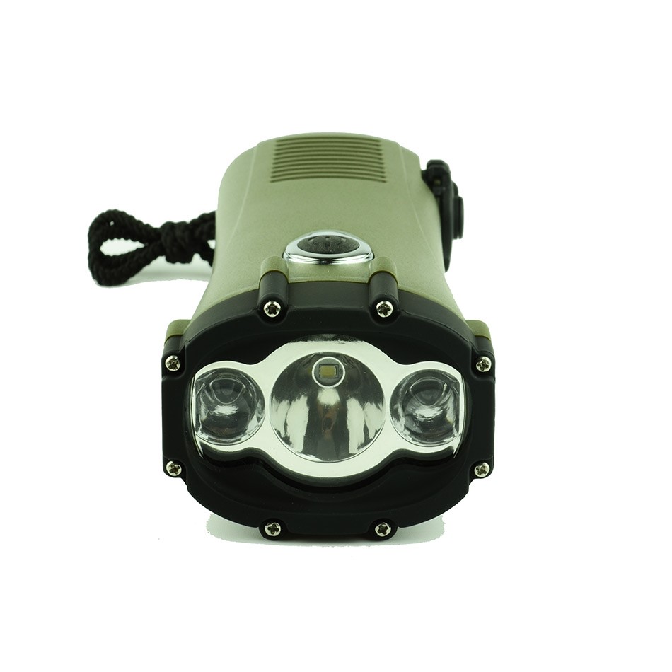 1.照明使用:一手握住主体,一手摇动摇柄,DC座边的充电指示会点亮,以2.5-3圈/秒的速度手摇一分钟后,按下开关按键,四次一循环:2个Φ5发光管亮——1W发光管亮——1W发光管闪——全灭。