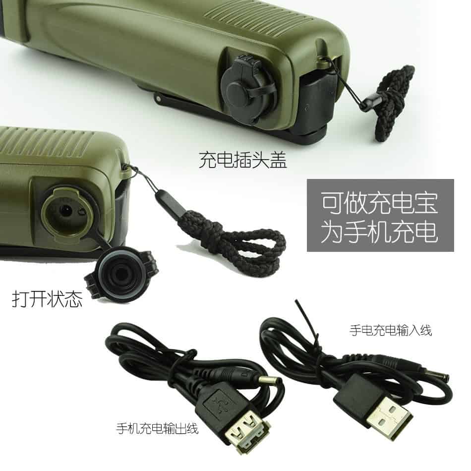 2.对手机充电:打开DC盖,把连接线一头插入本品插座,一头插入手机充电插座;一手握住主体,一手摇动摇柄;以2.5-3圈/秒的速度手摇,手机有充电指示,即正在充电。