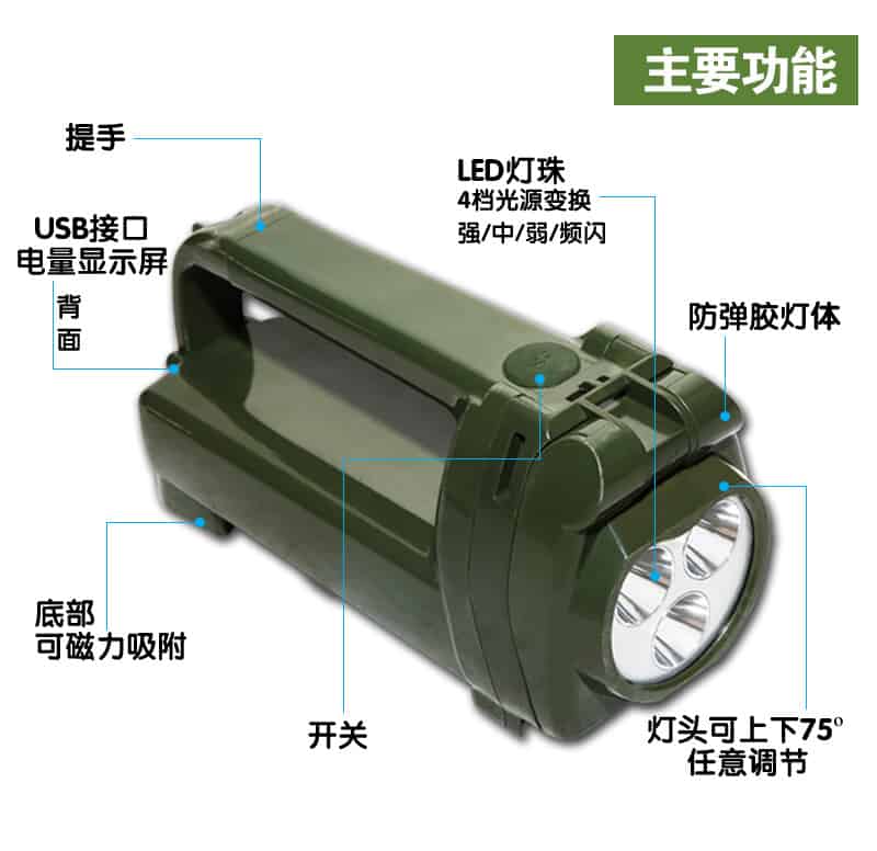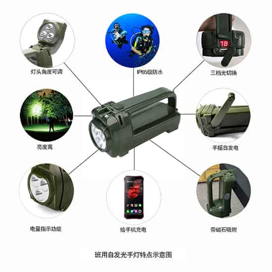 2.具有工作光、强光、泛光三种照明模式,灯具可便利手摇发电,尤其适用搜索照明使用,续航能力强。