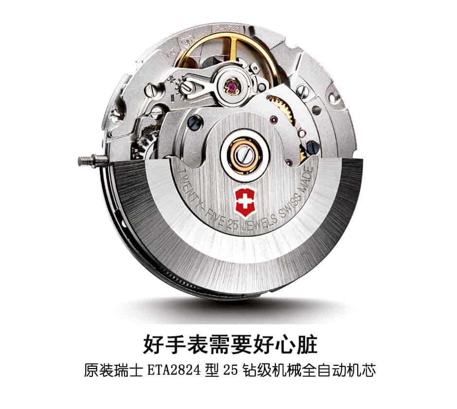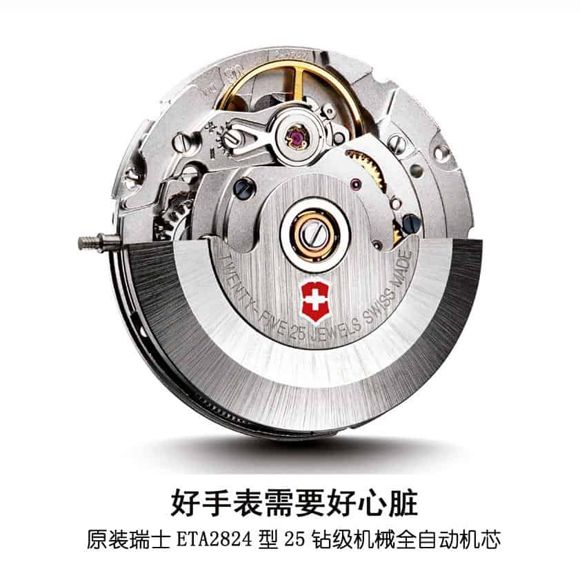 机芯采用瑞士ETA2824-2机芯或瑞士原装其它大品牌机芯,机芯为25钻,动能储备48小时,走时准,故障率低,性能可靠。