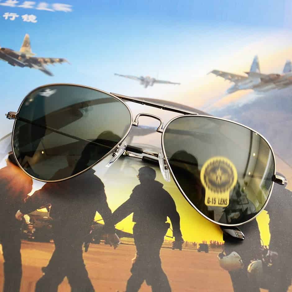 本店展示的这副眼镜为偏光太阳镜,采用光学玻璃镜片而非树脂镜片,寿命长,不易有划痕。貌似是选用较多的款式。在眼镜的右上方镜片上,印制有“飞行徽标”。