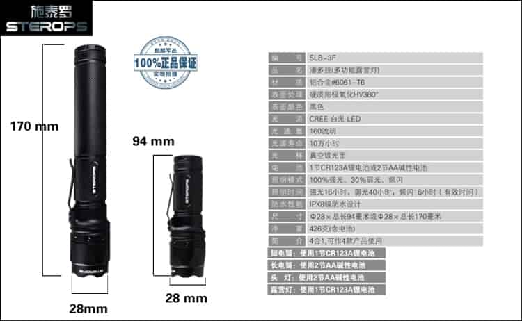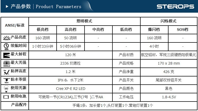 在使用的时间上1个CR123A电池时,100%持续照明时间为160分钟(未包括光衰时间);在使用2个AA电池时,100%持续照明时间为120分钟(未包括光衰时间)。而时间长短不同的原因是由于锂电池和碱性电池的容量差所导致的。