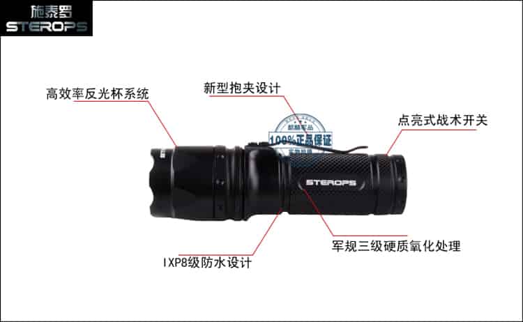 特殊的表面处理:优点是耐刮擦、较难刮损。这是一种最新研制出来的阳极处理方式:Ⅲ级阳极处理。这是一种比较复杂的处理过程,是在某种恒定的条件下使金属表面发生反应形成致密氧化层。处理后的金属表面硬度可以达到HRC50-60度,而一般的阳极处理的手电筒表面硬度只有HRC18-19度。但这种处理对金属材质也有特殊要求,以目前的处理技术而言要进行这一处理“材质”是非常关键的——必须选用“航空铝材”、并且着色上也是有恒定的色泽标准。