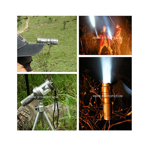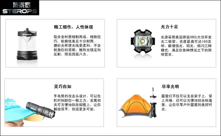 在户外照明装备中,头灯、手电筒和露营灯都是必须的装备。我们的设计师在亲身体验了户外野营的感觉后,设计了这款4合1功能的产品。特殊的铝材加上超硬的表面处理能最大程度上满足户外使用的需要。镜箍、灯头和灯身都可以灵活旋开;来适用您的选择。采用而AA电池和锂电池互换的方法来解决锂电池难求的问题。