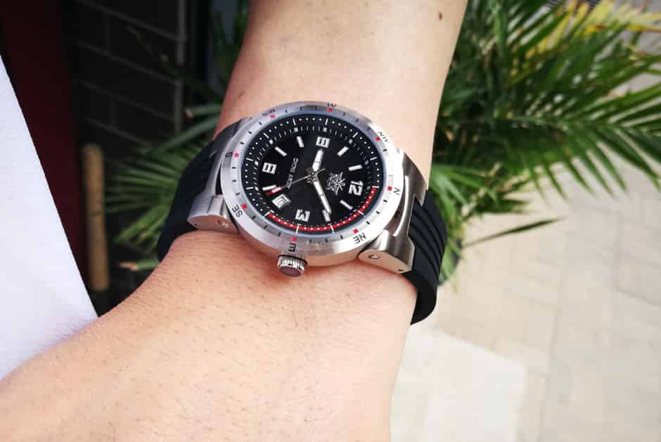 表壳使用拉丝工艺,一是为了防止反光,二是为了提高不锈钢金属的质感。请看实物拍照: