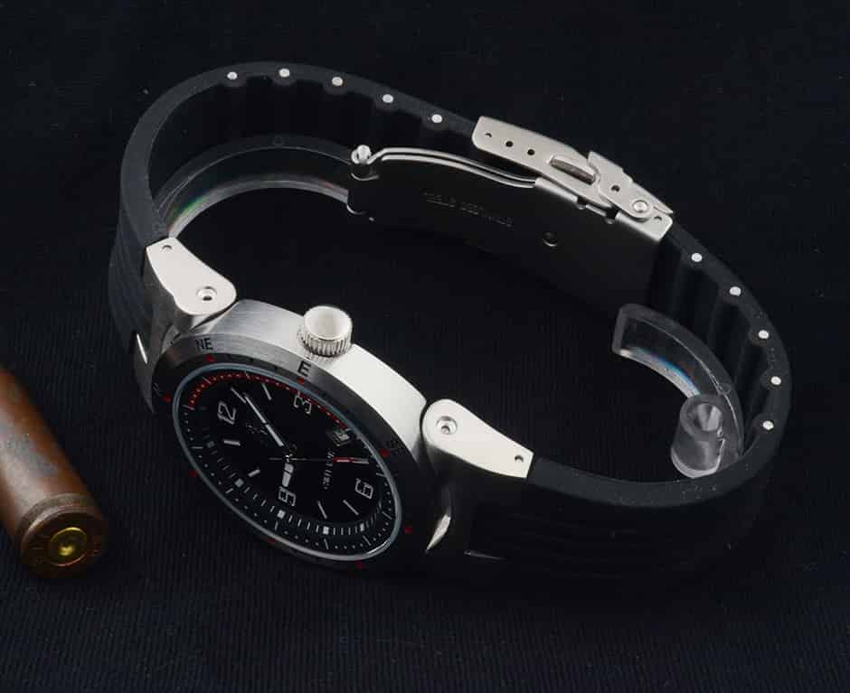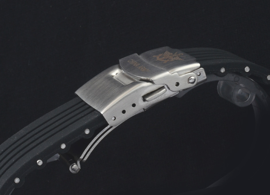 表带使用柔软有弹力的橡胶腕带,橡胶表带是户外运动爱好者常用的表带之一,因为贴合手腕很好,不像纯钢表带那样宽松会显得很利索,不会阻碍您的运动发挥。表带可以根据自己的长短需求进行截取,用一个牙签,一个壁纸刀就能实现表带的截短,方便操作。另外,在表带按扣上也有调节表带长短的功能。