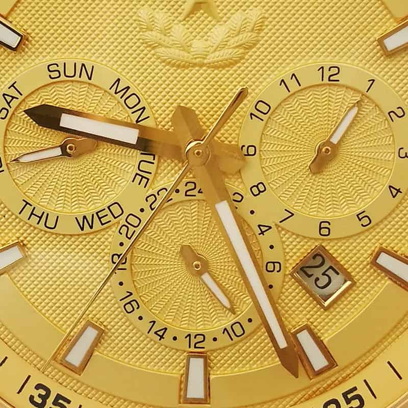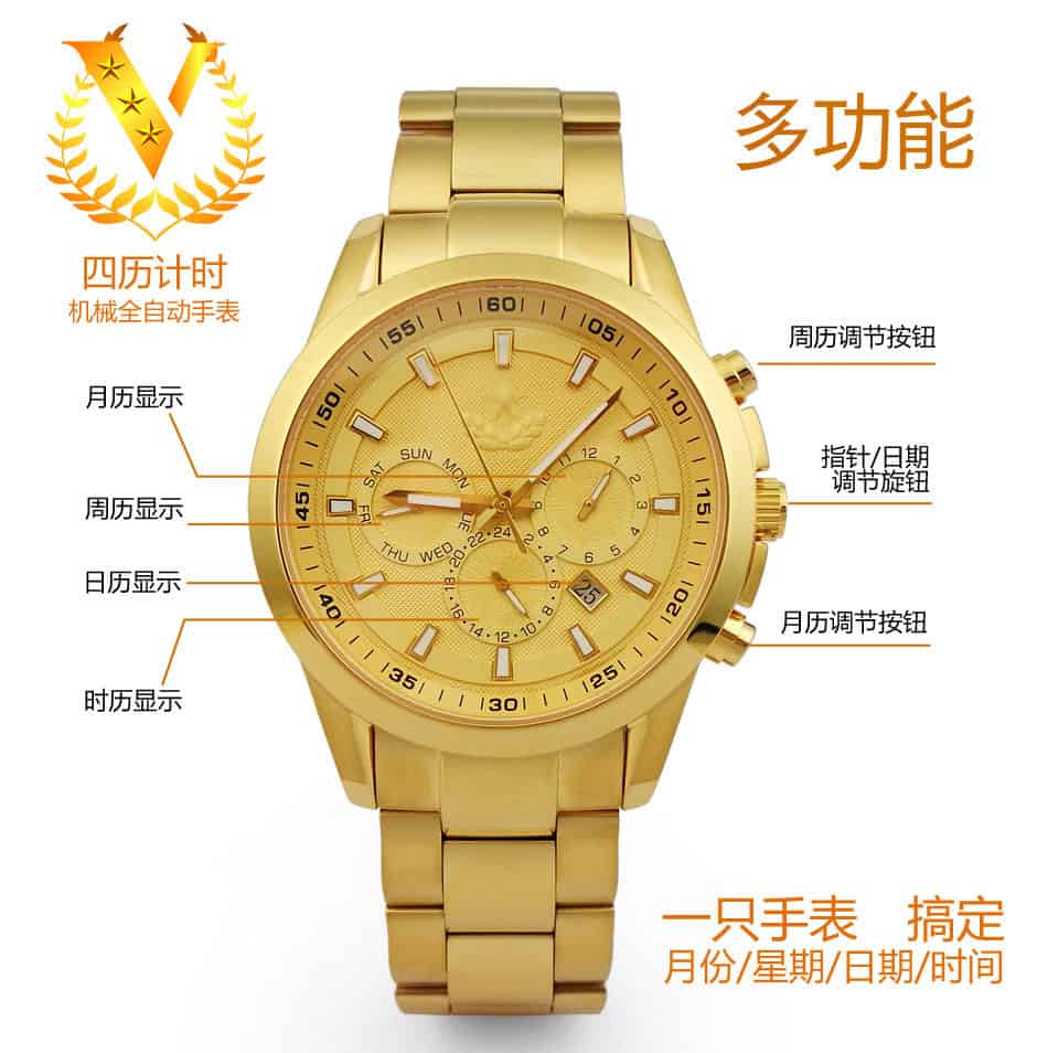 一般机械表,只有单历或双历,即日期历或者周历,而本款不仅涵盖了以上2个日历,还涵盖了月历,即几月,还有24小时历,即现在是一天的第几个时辰。