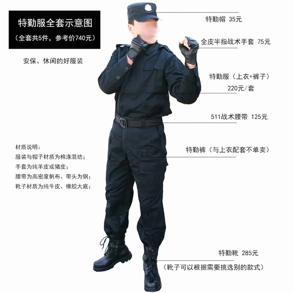 特勤套装由于通体黑色,平常购买人群大多数集中在特勤、内保,保安、物业等单位,衣服的设计便于大幅度动作,如训练,跑步、攀越等,因而被许多身手灵活的运动人士喜爱!