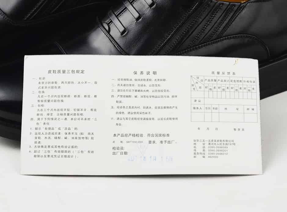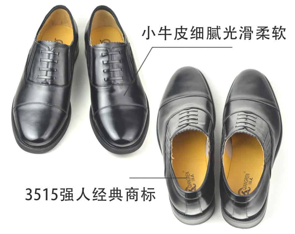 本双三接头皮鞋是2011年左右,强人3515厂生产的一批皮鞋,鞋子面部和里部等所有部位均使用天然牛皮材料,尤其是鞋面外表,都采用进口小牛皮制造,皮质细腻、柔软。是标准款型的正装皮鞋。
