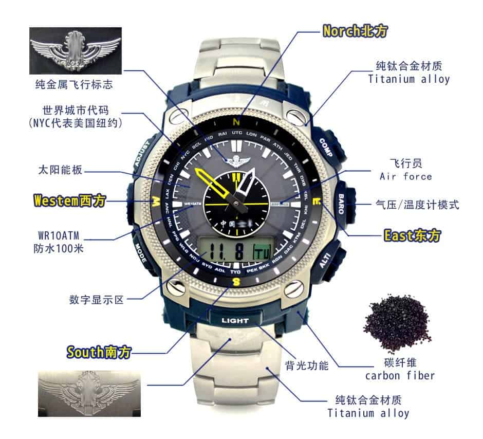 第二代飞行员作训表,光动能机芯,海拔气压指北等户外多功能表