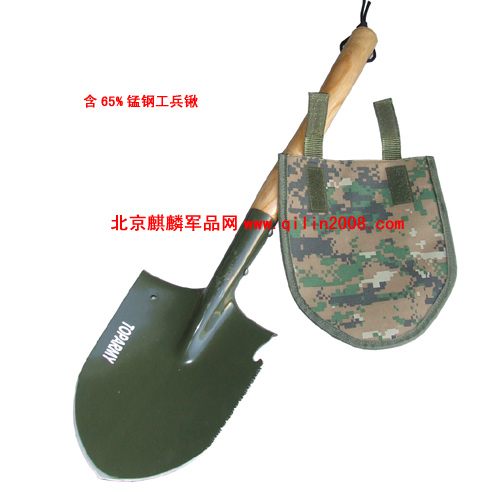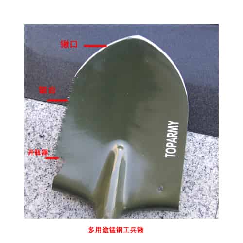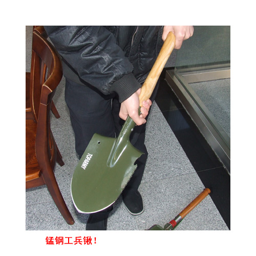 本款工兵锹的最核心部分——锹头,采用锰钢制造,钢口很好,非市面上一般工兵铲可比。锹把采用实木。本款不可折叠。 尺寸:长度63厘米。