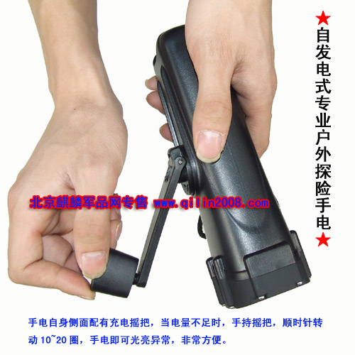 1.照明使用:一手握住主体,一手摇动摇柄,DC座边的充电指示会点亮,以2.5-3圈/秒的速度手摇一分钟后,按下开关按键,四次一循环:2个Φ5发光管亮——1W发光管亮——1W发光管闪——全灭。