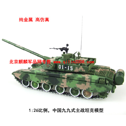 中国99式主战坦克是中国最先进的坦克,每辆造价千万,在祖国50年大庆的时刻,首次在天安门两项就引起军迷的轰动,本次,本厂生产的1:26比例中国九九式主战坦克模型采用先进数字技术开模制造而成,仿真度几乎达到完美,不仅炮塔、炮管、履带等可以自由活动,其他部位也较以前的坦克模型更加逼真,是模型收藏爱好者难得一见的宝贝,欢迎订购。