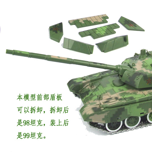 本模型的特点是具有98坦克模型和99坦克模型随意变换。当拆卸下前部驾驶舱和炮塔舱的装甲护板时,变成为98坦克,装上之后就是99坦克,如图所示。