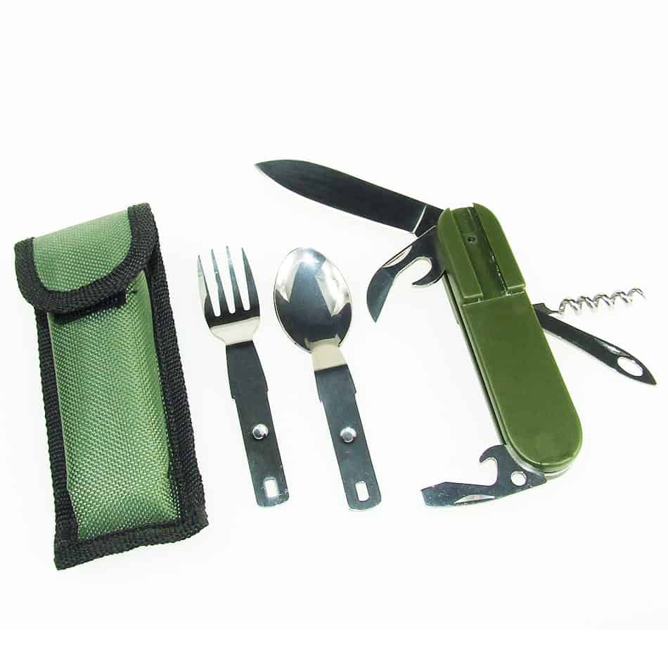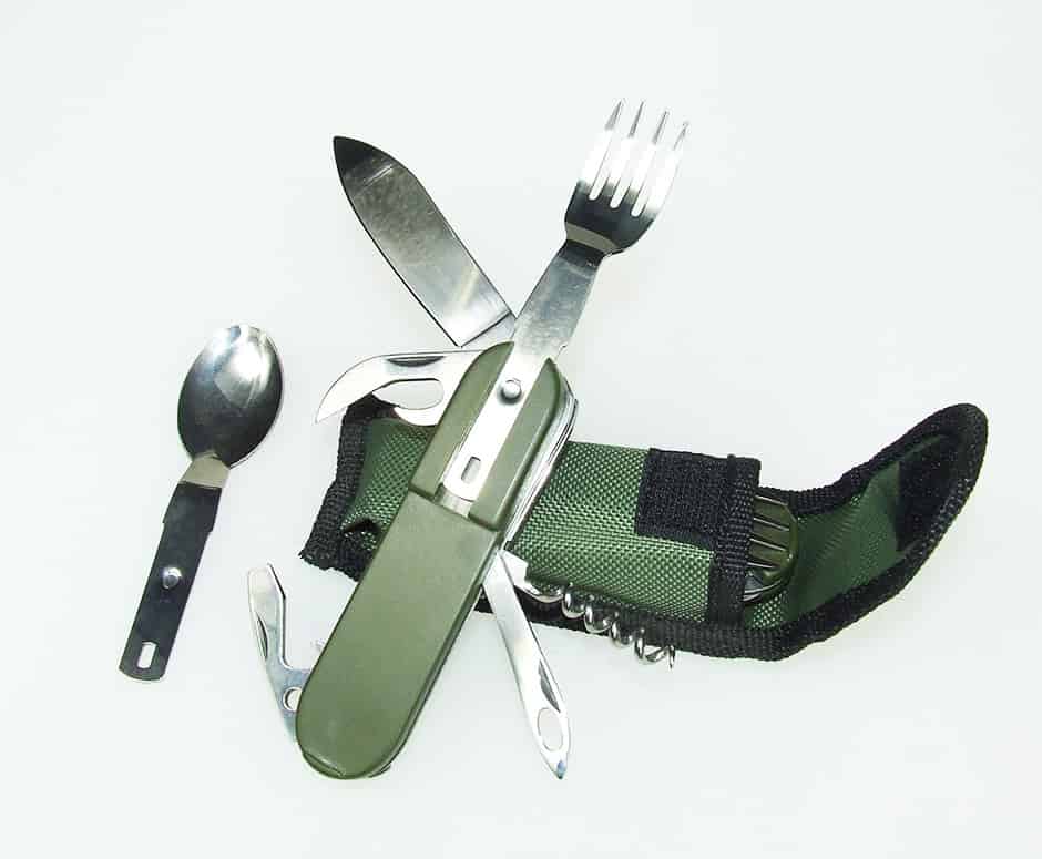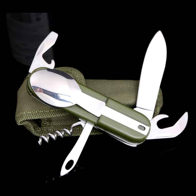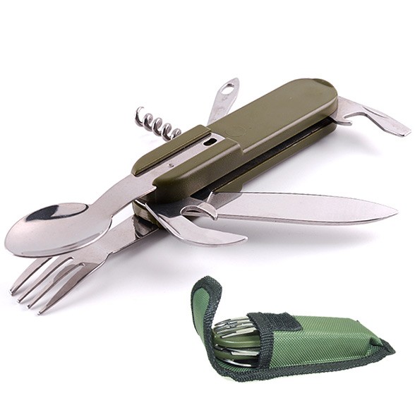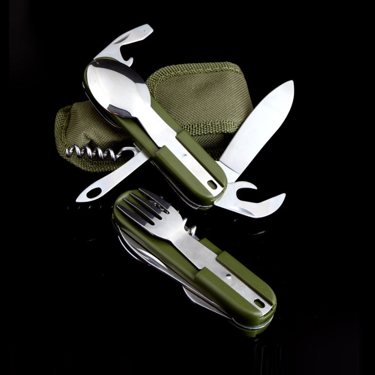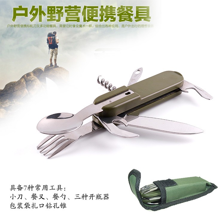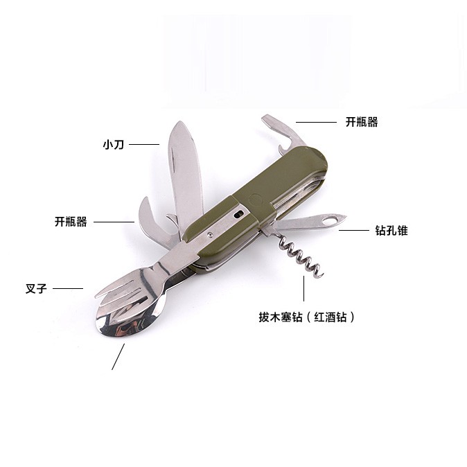 本物为多家单位和户外组织经常订购的物品,一件刀集合了7种工具,分别是:刀、叉子、勺子、红酒启瓶器,啤酒启瓶器、罐头启瓶器和锥子。非常实用。